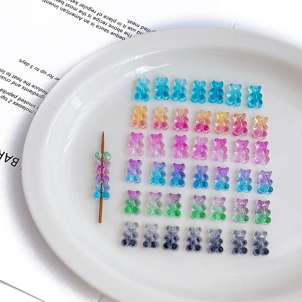 Koraliki akrylowe, misie miśki - wyglądają jak popularne żelki. 20 sztuk w miksie cieniowanych kolorów. W dotyku są gładkie i śliskie jak prawdziwe miśki żelki.