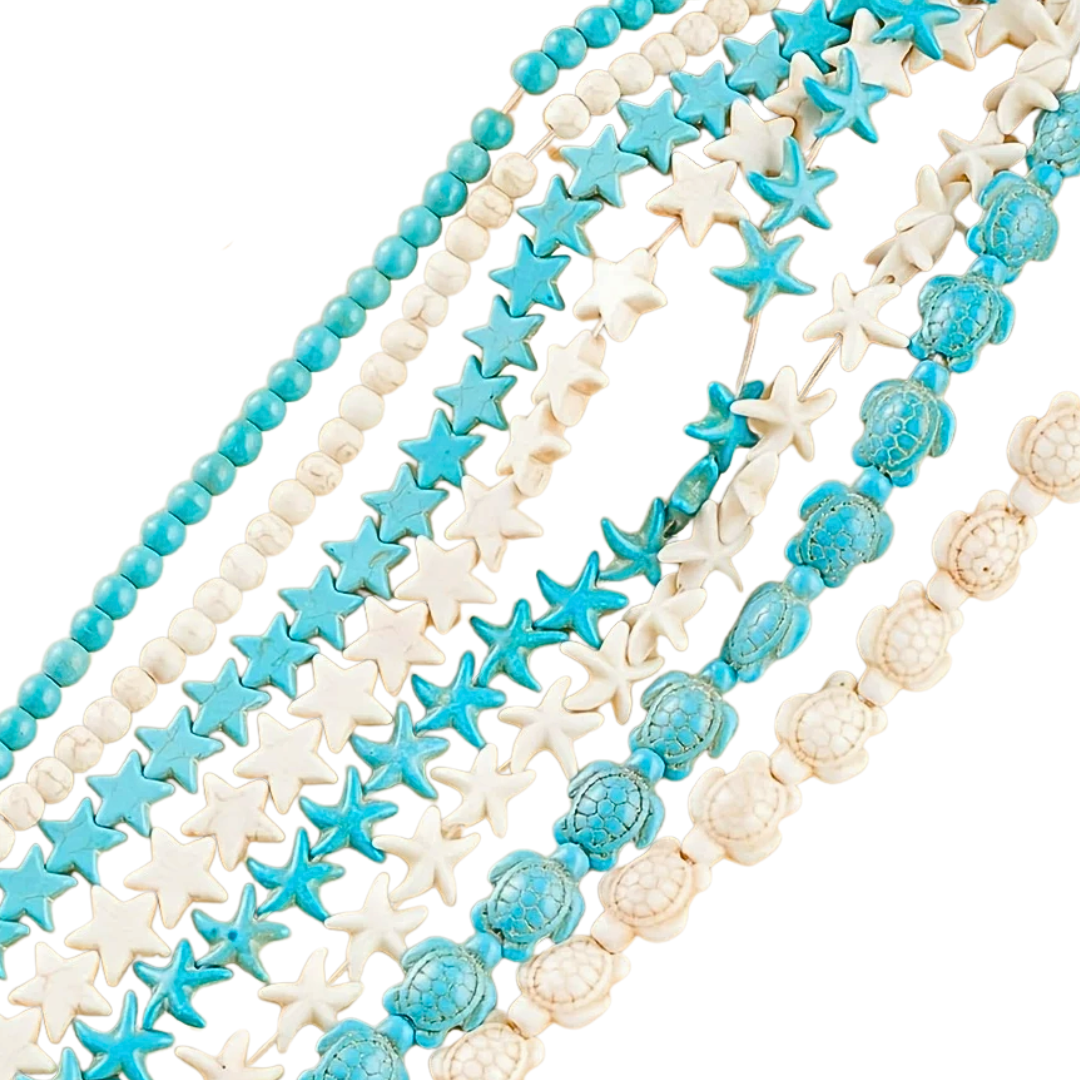 Ten zestaw zawiera około 32 różnych koralików, w dwóch kolorach: turkusowym i kremowo białym.