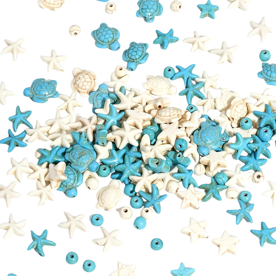 Wymiary koralików: żółw około 14mm, gwiazdka 12mm, rozgwiazda 14mm, kulka 8mm.