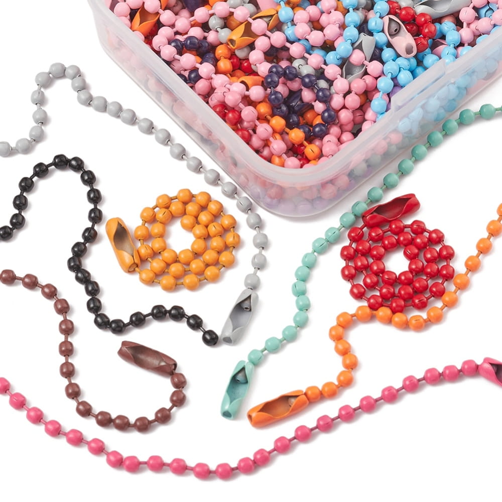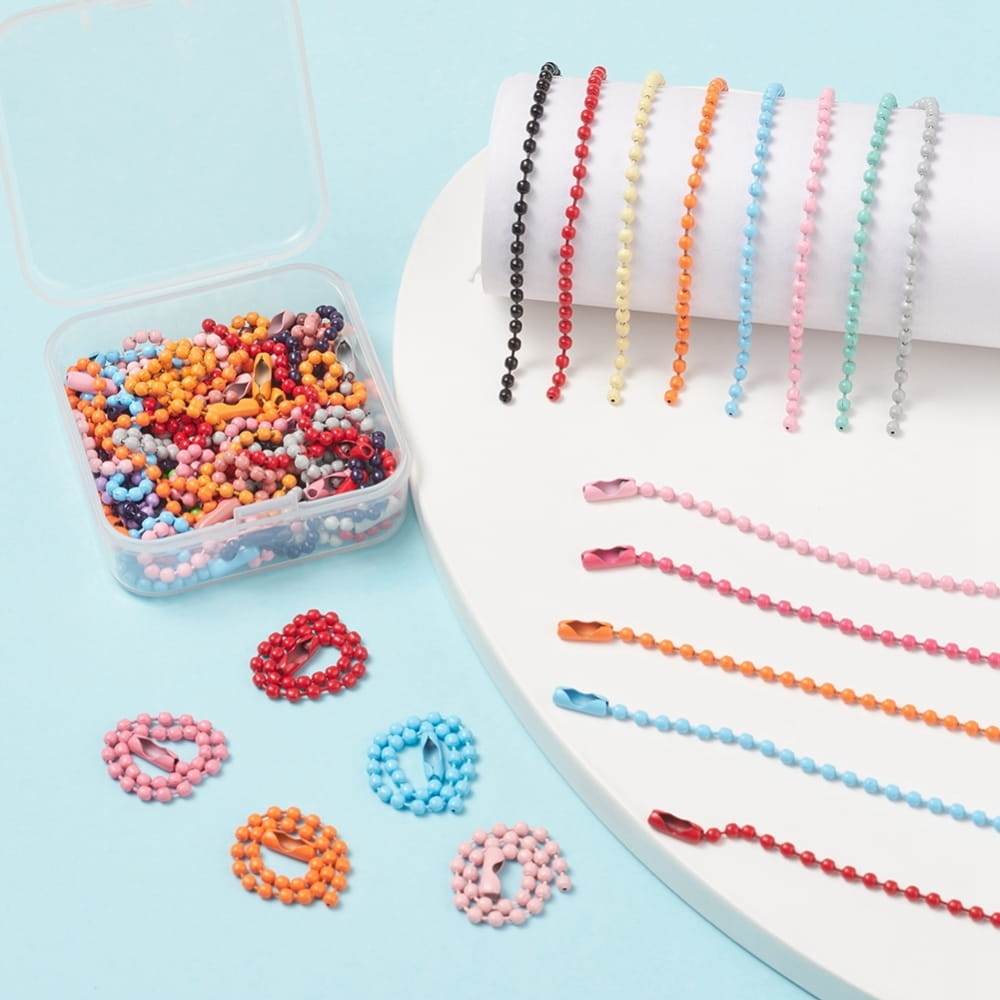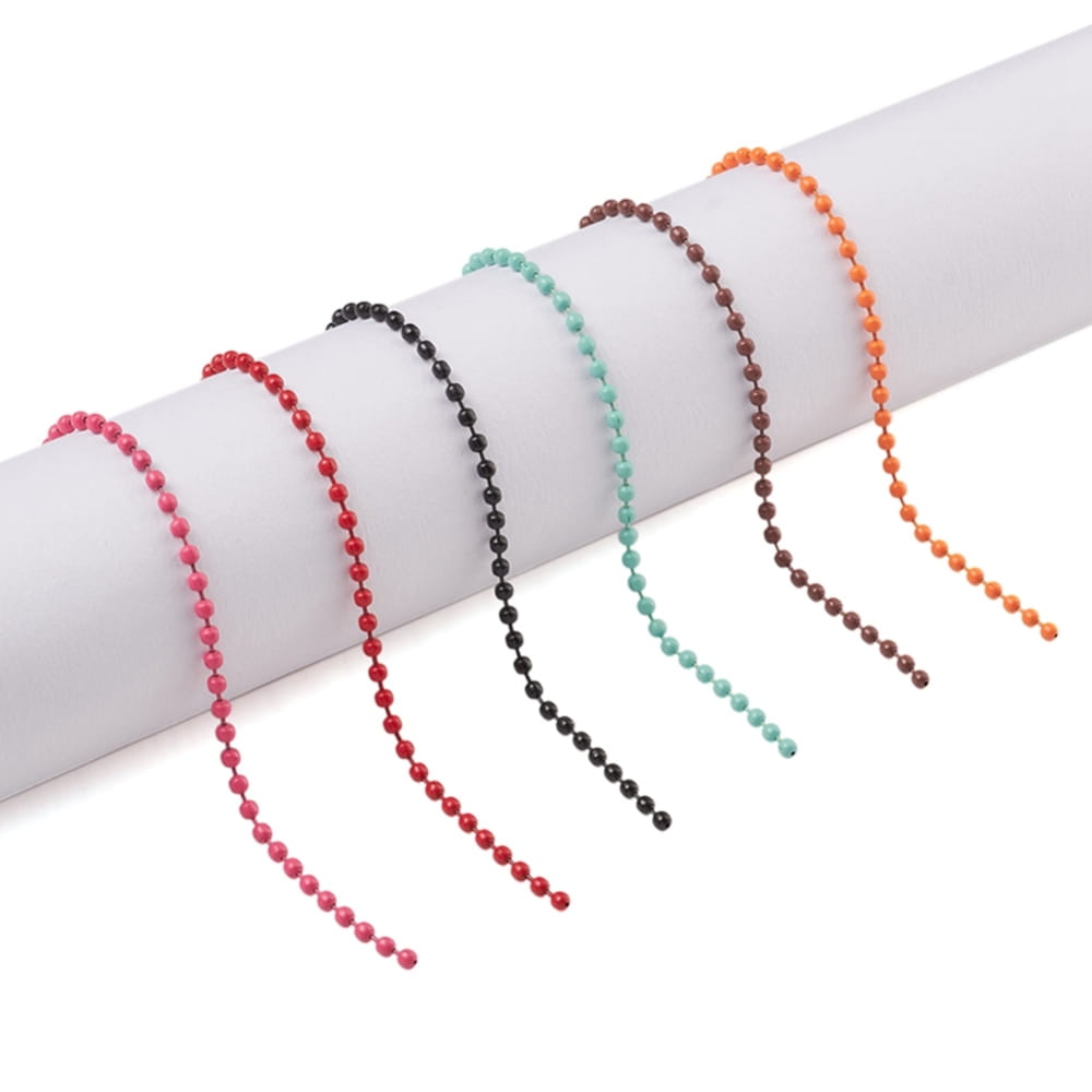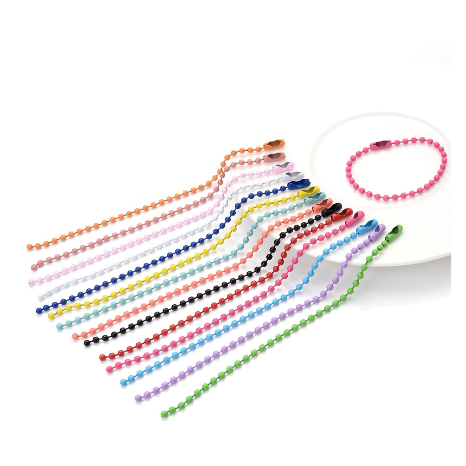 Łańcuszki kulkowe z zapięciem, metalowe, miks kolorów - duży zestaw 50 sztuk. Grubość około 2.5mm. Sprzedawany w kawałkach o długości 12 cm. Każdy łańcuszek ma zapięcie. Do tworzenia biżuterii, rękodzieła. Znakomicie sprawdza się np. przy łączeniu papierowych metek z produktami.