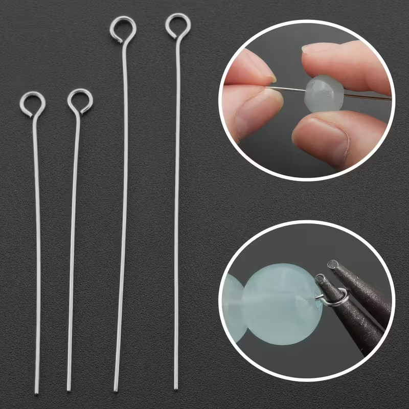 Igły jubilerskie, szpilki montażowe, haczyki z oczkiem. Wykonane z miękkiego drutu, dlatego niektóre mogą być delikatnie wygięte, ale dzięki temu są łatwe do zaginania. Można je bardzo łatwo wyrównać. Świetne do wyrobu bransoletek, breloków, naszyjników, zawieszek z koralików.