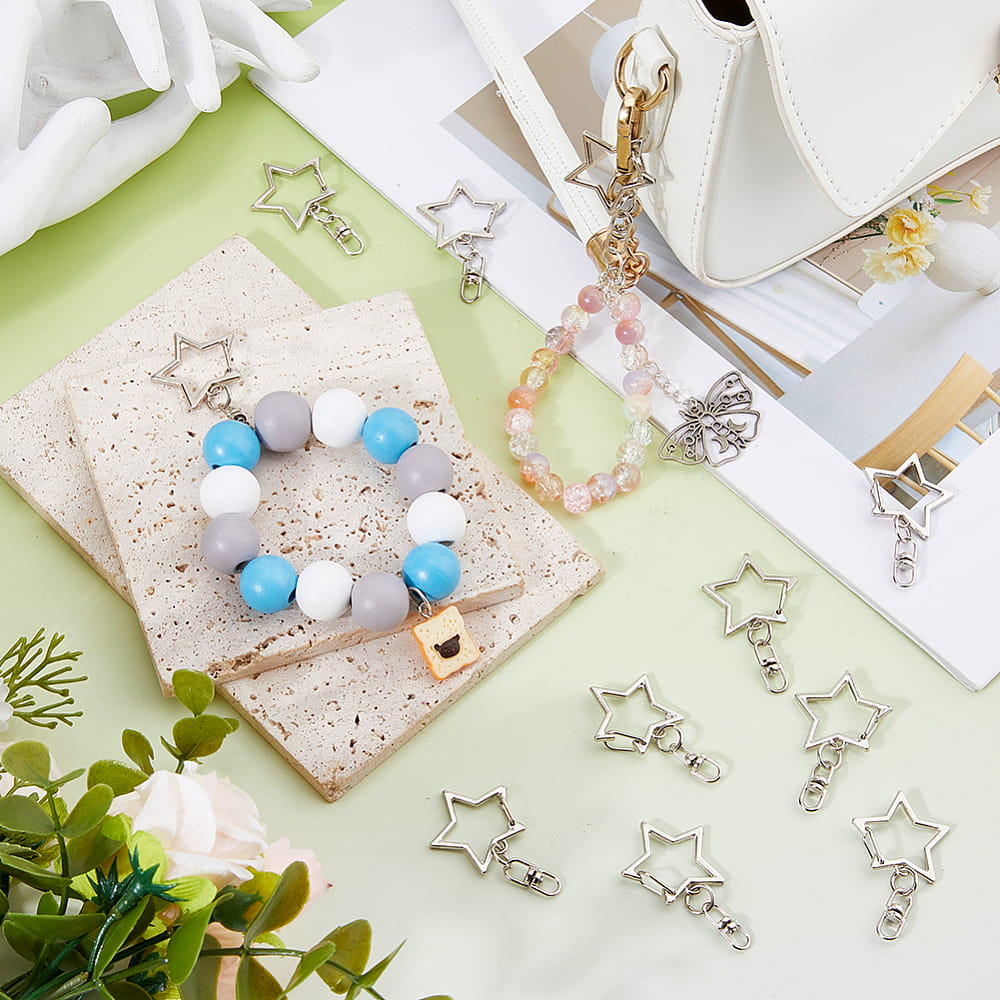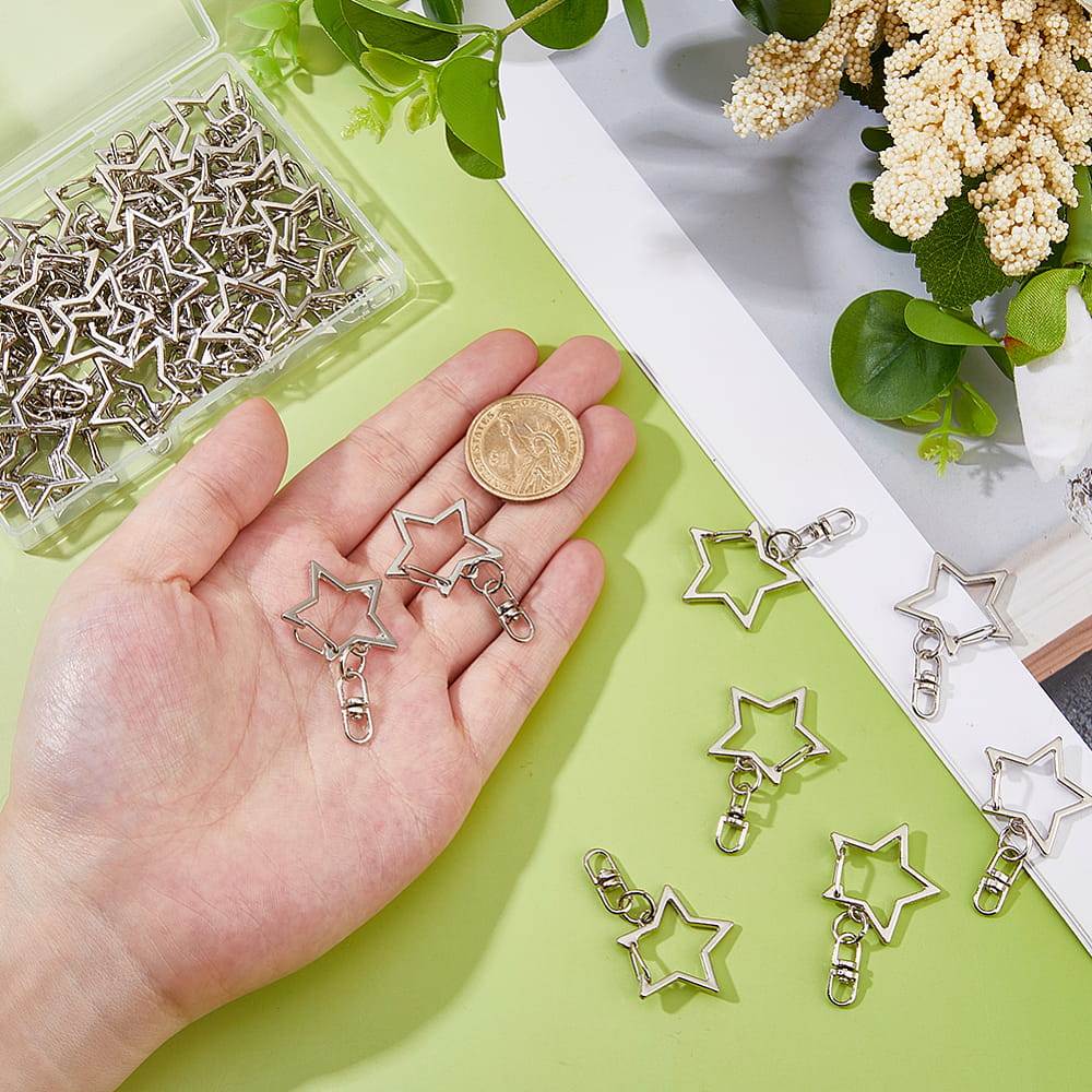 Brelok jest zamykany jak klasyczny karabinek, do dużej gwiazdki jest doczepiona przedłużka obrotowa. Nadaje się do przypinania zawieszek i innych elementów dekoracyjnych. Świetna baza, by wykonać brelok ozdobny.
