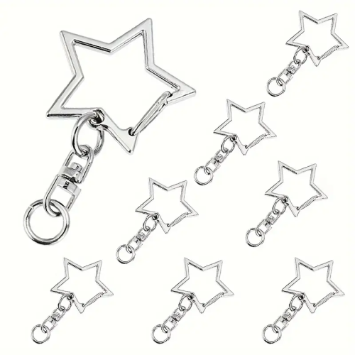 Brelok jest zamykany jak klasyczny karabinek, do dużej gwiazdki jest doczepiona przedłużka obrotowa między dwoma kółkami ogniwami. Ogniwo na jej końcu (dołączone luzem) nadaje się do przypinania zawieszek i innych elementów dekoracyjnych. Świetna baza, by wykonać brelok ozdobny.