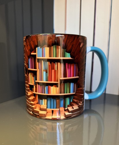 Ucho i wnętrze kubka w kolorze turkusowym, wzór z biblioteczką pokrywa kubek naokoło.