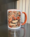 Ucho i wnętrze kubka w kolorze pomarańczowym, dwa różne wzory po każdej stronie kubka.