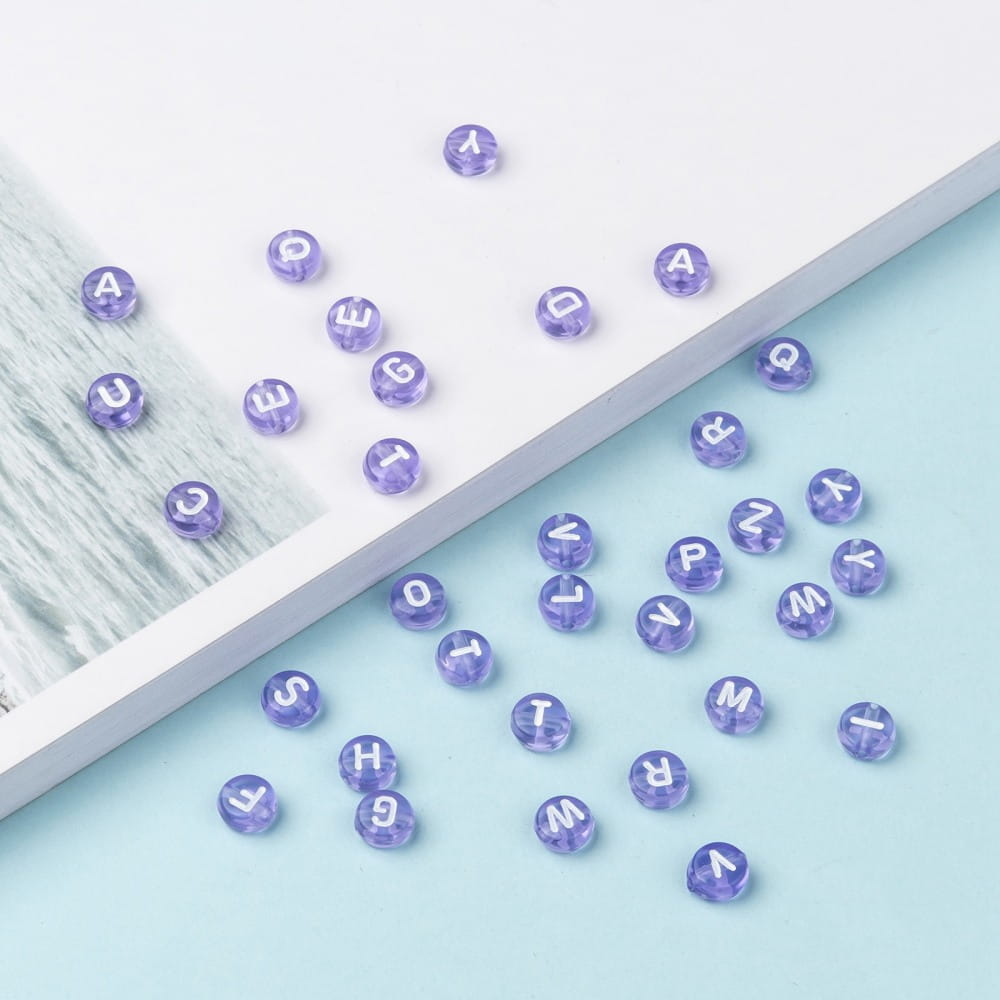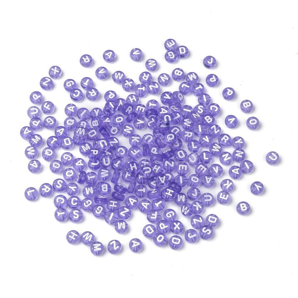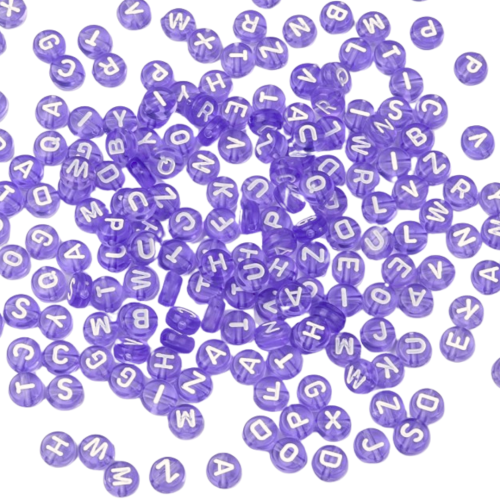 Koraliki przezroczyste fioletowe + białe literki.