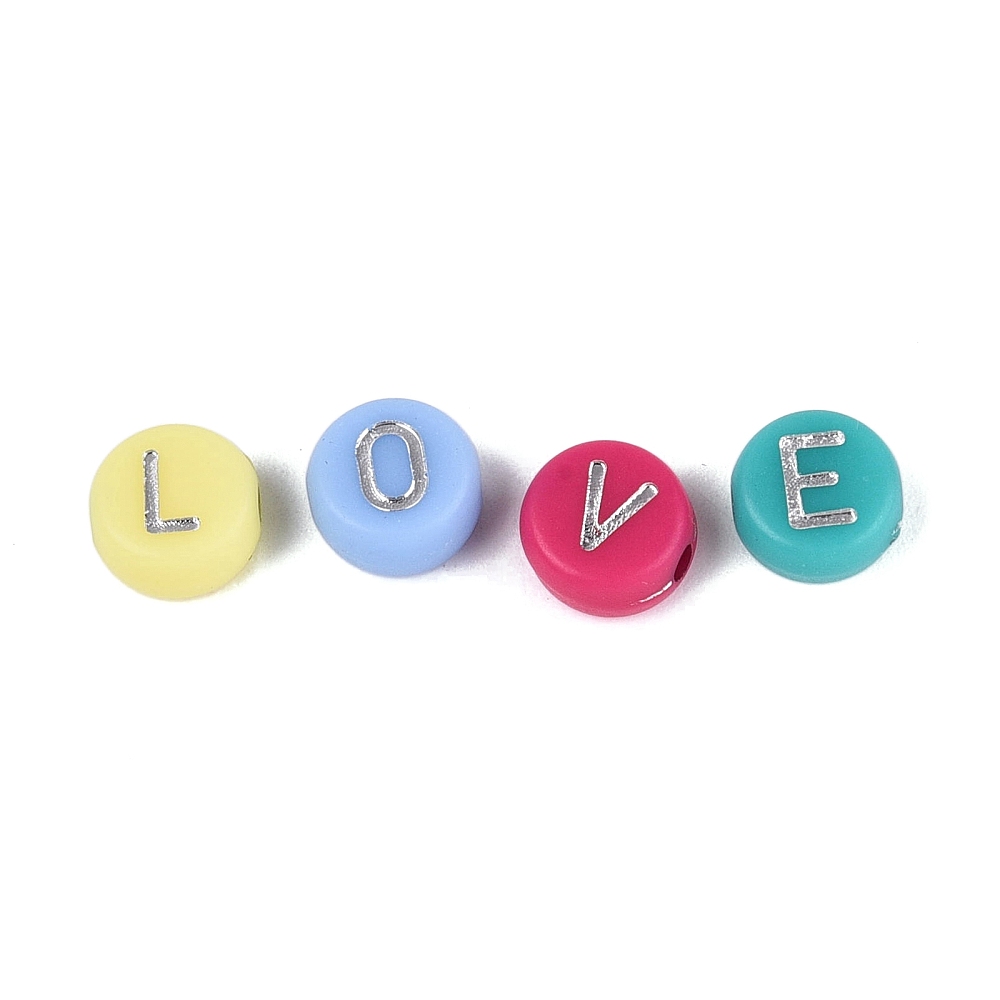 Koraliki nieprzezroczyste kolorowe zwykłe i neonowe + srebrne literki.