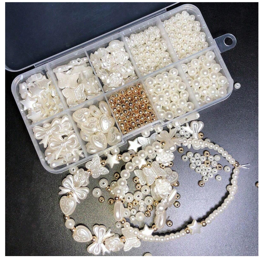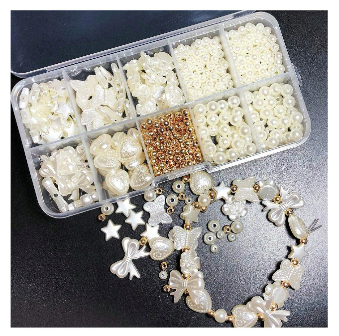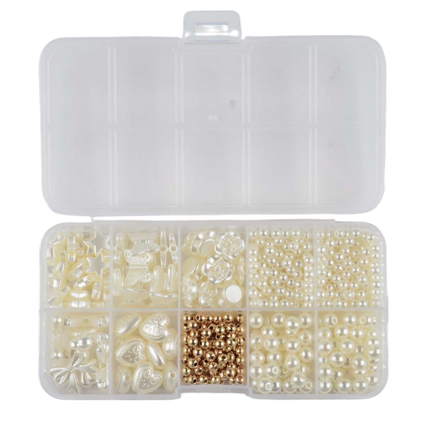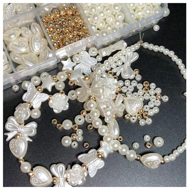 Zestaw koralików perły perełki sztuczne i złote przekładki w plastikowym pudełku (organizator). Ślubny Miks wzorów przekładek i rozmiarów perełek. Bardzo ładnie wykonane, równe, idealne do wyrobu bransoletek.
