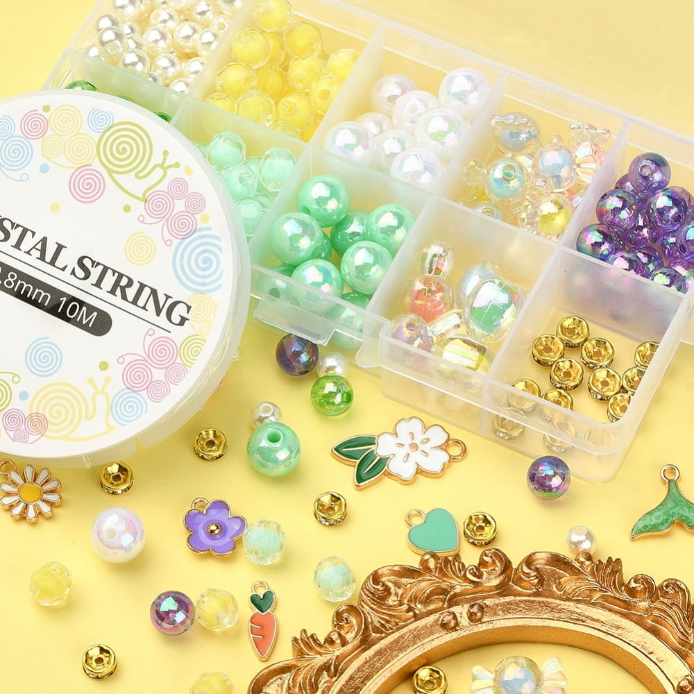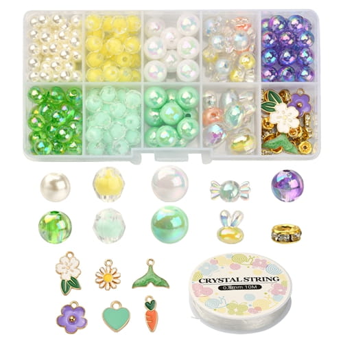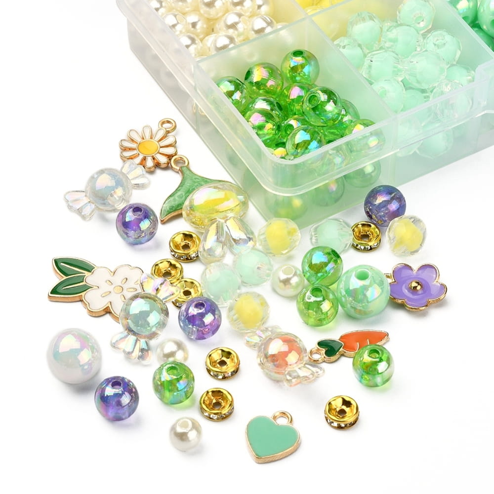 Zestaw koralików akrylowych fioletowych, zielonych CUTE KAWAII perełek, zawieszek w plastikowym pudełku (organizator) + elastyczna żyłka do biżuterii. Uroczy miks różnych koralików oraz zawieszek. Bardzo ładnie wykonane, idealne do wyrobu bransoletek.