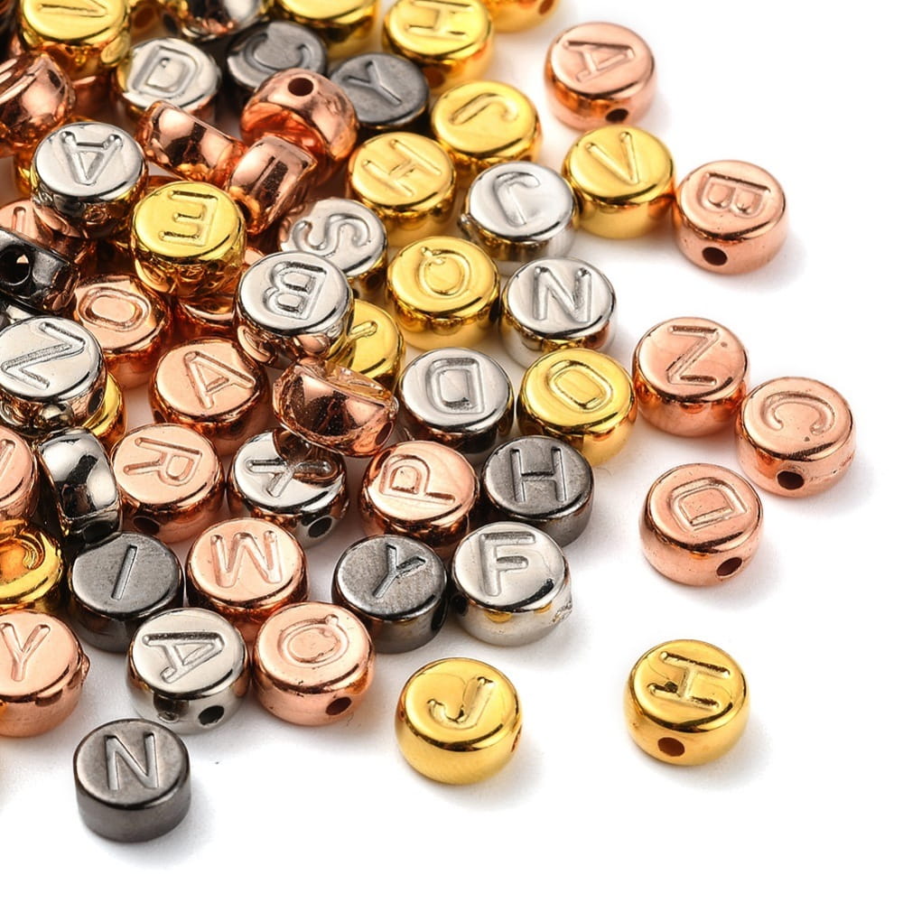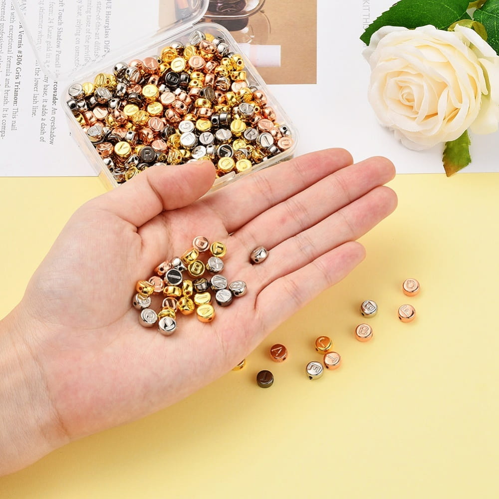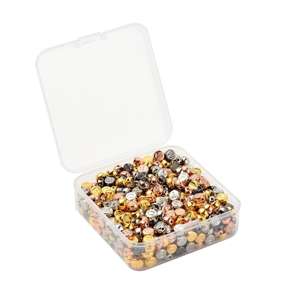 Koraliki literki metaliczne metalizowane CCB monetki 7mm do bransoletki mix aż 500 sztuk. Zestaw w praktycznej kasecie plastikowej.