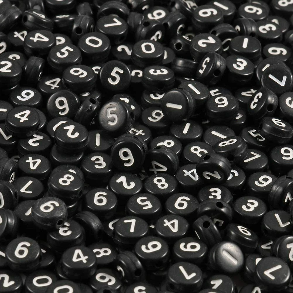 Koraliki literki czarne z białymi cyferkami monetki 7mm do bransoletki mix 100 sztuk.