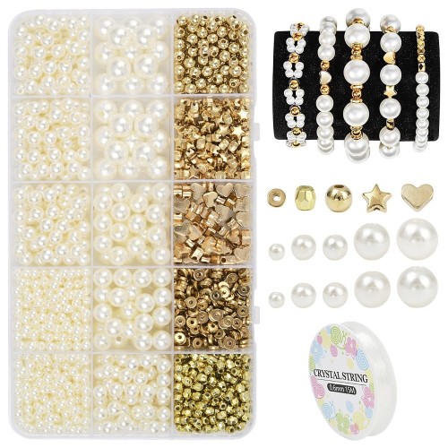 Zestaw koralików perły perełki sztuczne i złote przekładki CCB, powlekane metalicznie w plastikowym pudełku (organizator). Miks wzorów przekładek i rozmiarów perełek. Bardzo ładnie wykonane, równe, idealne do wyrobu bransoletek. Zapakowane wg gatunku w osobne komórki, ilość jak na zdjęciu. Około 1165 sztuk łącznie.