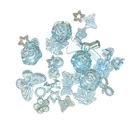 KOK14 Koraliki akrylowe przezroczyste MIX kształtów róże motylki błękit 25g