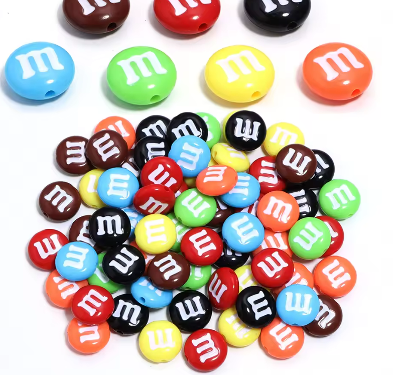 Koraliki akrylowe, 5 sztuk, imitacja cukierków m&m M&M's. Miks 5 różnych kolorów w opakowaniu.
