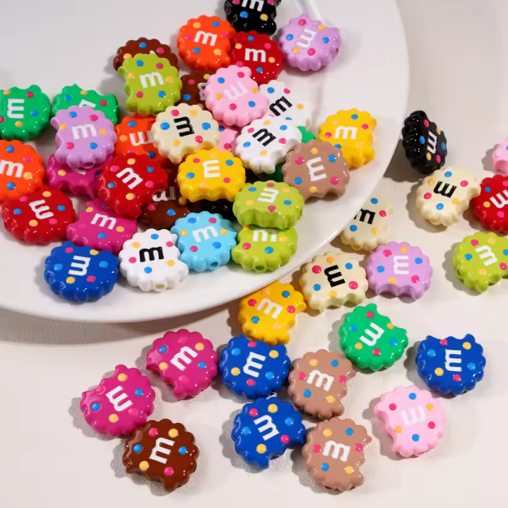 Koraliki akrylowe, 5 sztuk, imitacja ciastka lub cukierków m&m M&M's. Miks 5 różnych kolorów w opakowaniu.