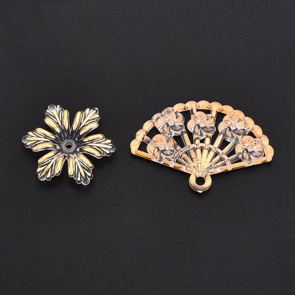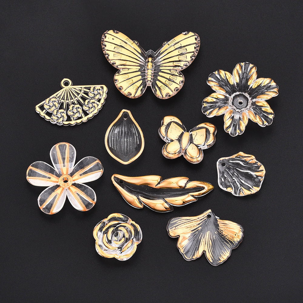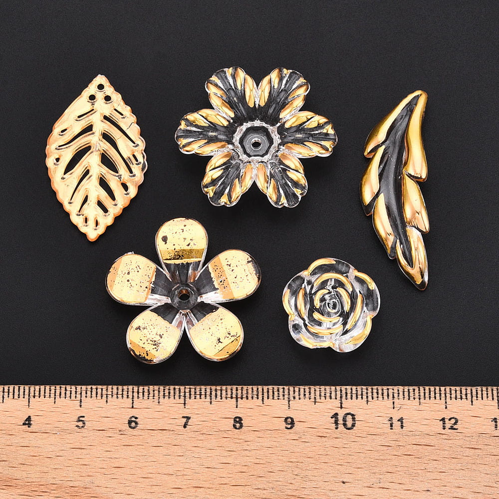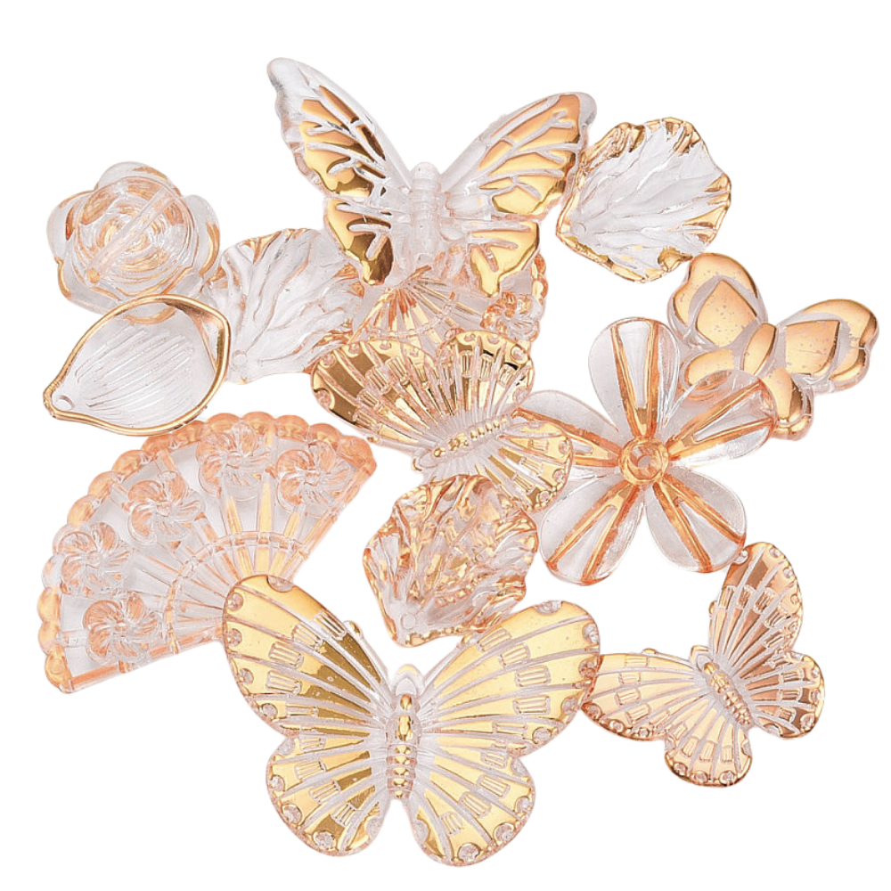 W opakowaniu znajduje się 25g koralików, różne kształty. Od dużych po malutkie. Między innymi róże, pióro, gwiazdka, motylek, kwiatuszek, wachlarz, ćma, muszle. Idealne, jeśli robisz bransoletki i inne wyroby biżuterii hand made, zwłaszcza te personalizowane. Koraliki są wykonane z trwałego akrylu, nie tracą koloru. Są świetne do wykonania breloków, zawieszek i zakładek do książek. Fajnie wyglądają w bransoletkach z koralików fimo katsuki oraz do koralików literki. Niektóre mają płaski spód, mogą być wykorzystane jako ozdobny kaboszon kwiatek.
