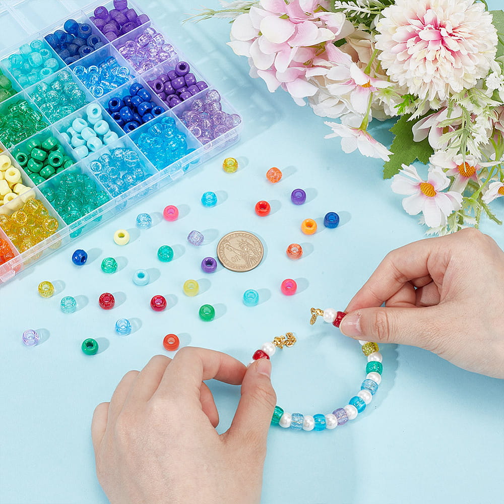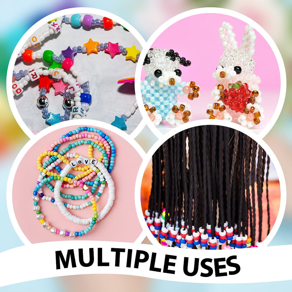 W opakowaniu znajduje się mnóstwo koralików w różnych kolorach w plastikowym organizerze. Idealne, jeśli robisz bransoletki i inne wyroby biżuterii hand made, zwłaszcza te personalizowane. Koraliki są wykonane z trwałego akrylu, nie tracą koloru, a duży otwór pozwala na ich stosowanie jako koraliki modułowe lub do ozdabiania fryzur. Są świetne do wykonania breloków, zawieszek i zakładek do książek. Fajnie wyglądają w bransoletkach z koralików fimo katsuki oraz do koralików literki.