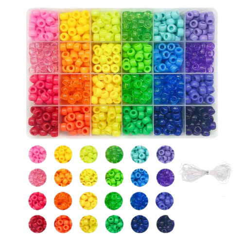 W opakowaniu znajduje się około 720 koralików w 24 różnych kolorach w plastikowym organizerze. Idealne, jeśli robisz bransoletki i inne wyroby biżuterii hand made, zwłaszcza te personalizowane. Koraliki są wykonane z trwałego akrylu, nie tracą koloru, a duży otwór pozwala na ich stosowanie jako koraliki modułowe lub do ozdabiania fryzur. Są świetne do wykonania breloków, zawieszek i zakładek do książek. Fajnie wyglądają w bransoletkach z koralików fimo katsuki oraz do koralików literki.