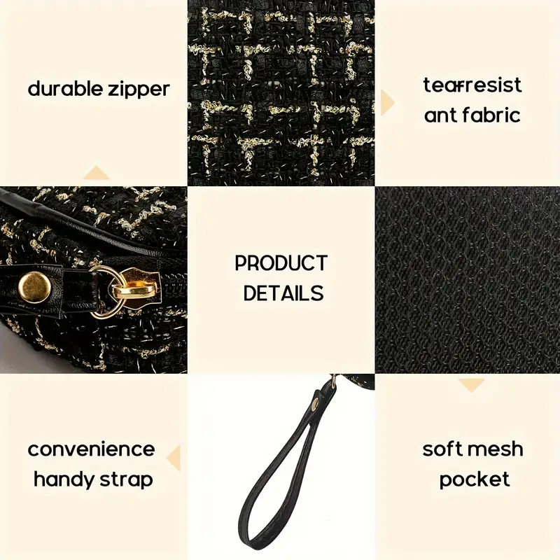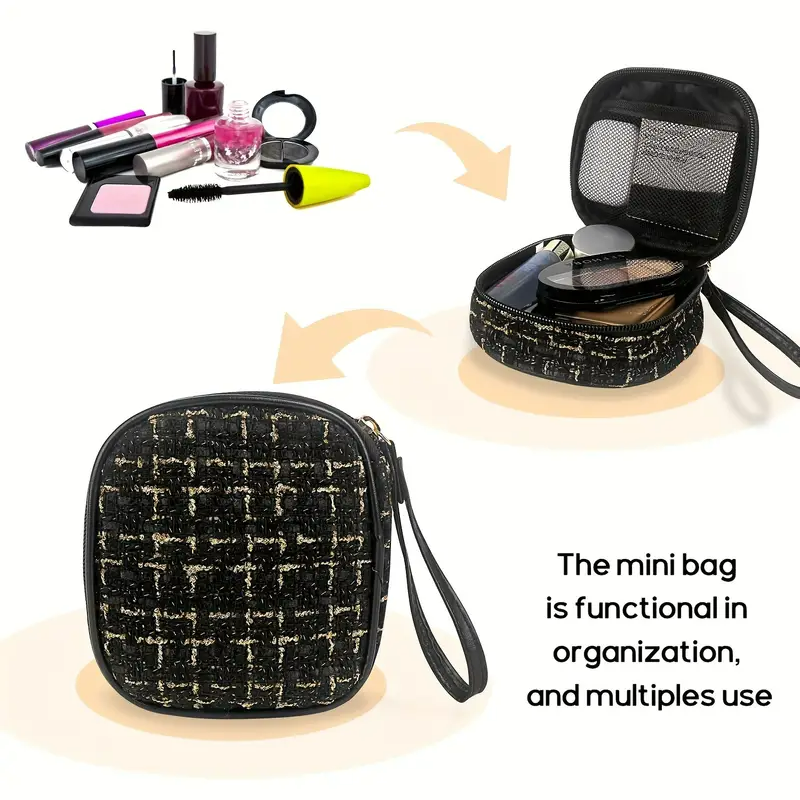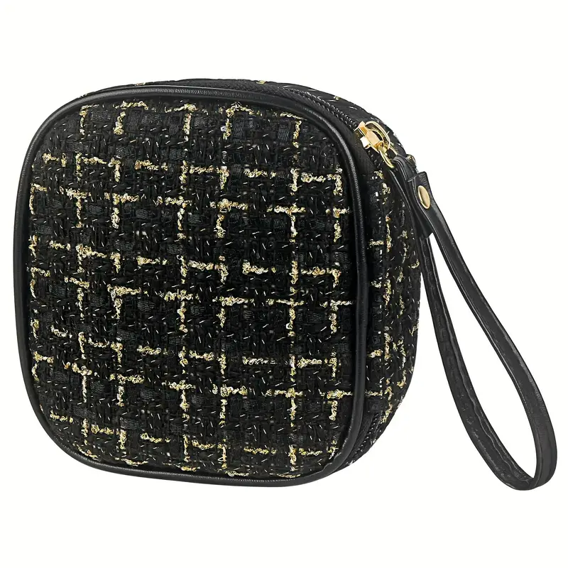Bardzo przydatna, pomieści niewielkie podręczne kosmetyki, uszyta z uroczej tkaniny boucle w kratkę, ze złotą nitką, w bardzo modnym i popularnym słodkim stylu: #coquette #girlygirl #lolita #ballerinacore czy #pinkaesthetic.