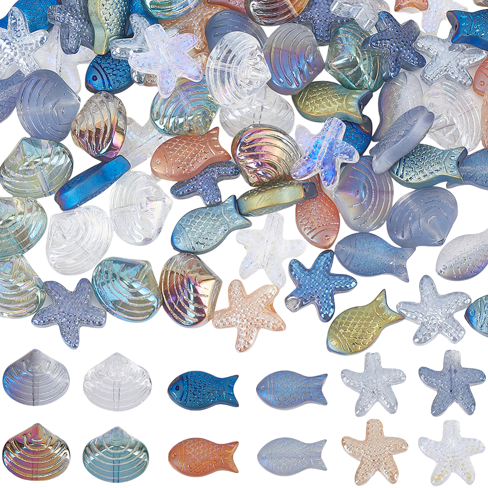 KSZ15 Koraliki szklane opalizujące MORSKIE OCEAN rybka rozgwiazda muszla 10szt miks