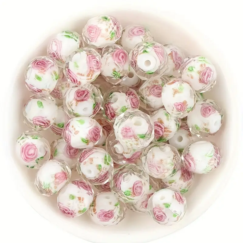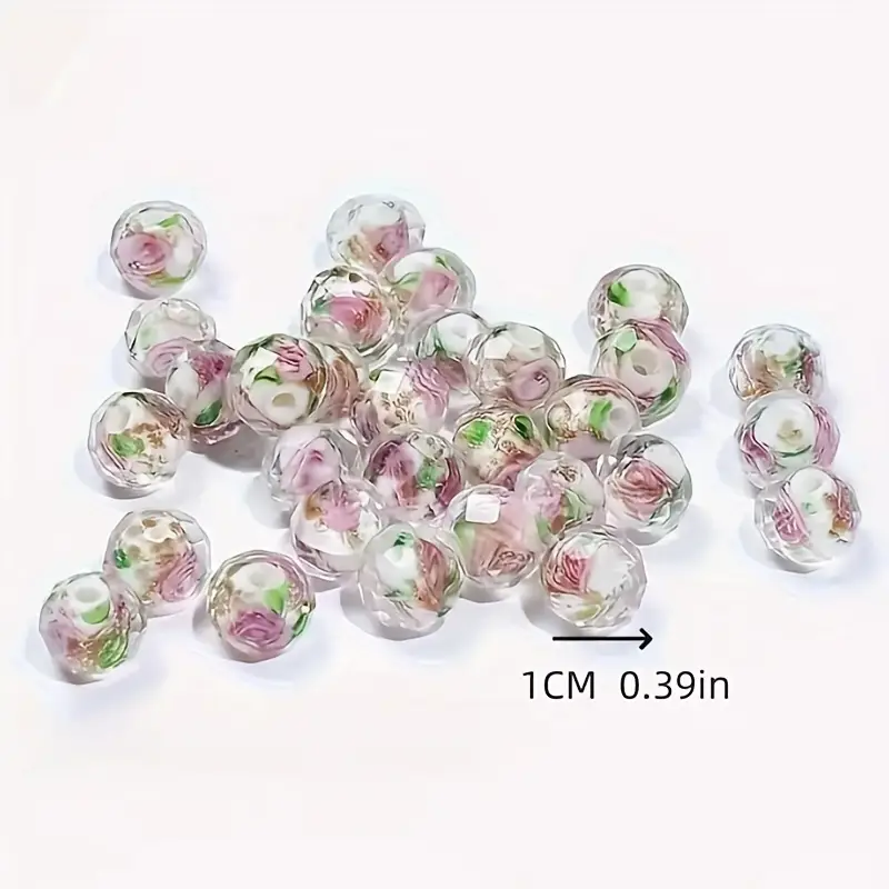 Ozdobione motywem różowej różyczki oraz złotego pyłku na białym środku, a to wszystko pod bezbarwnym szkłem, fasetowanym na kształt rondelle. Przez ręczne wykonanie każdy koralik jest niepowtarzalny.