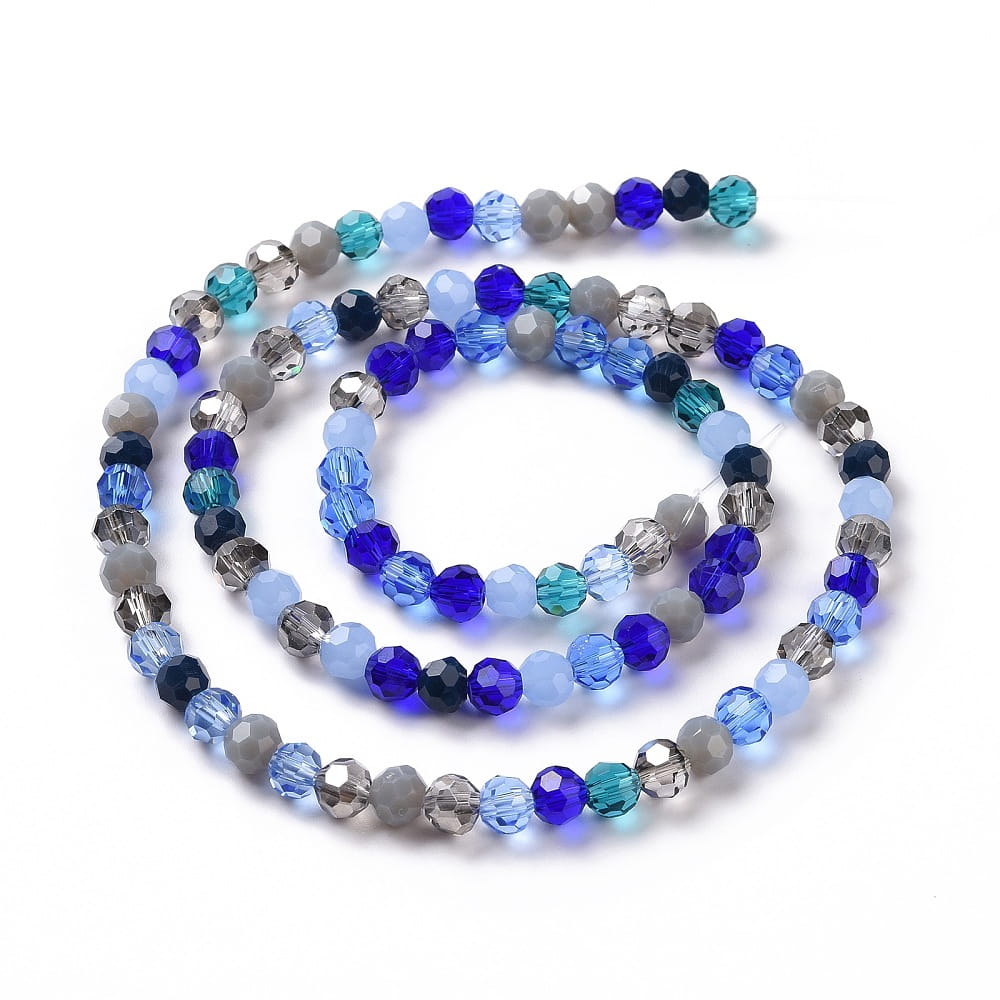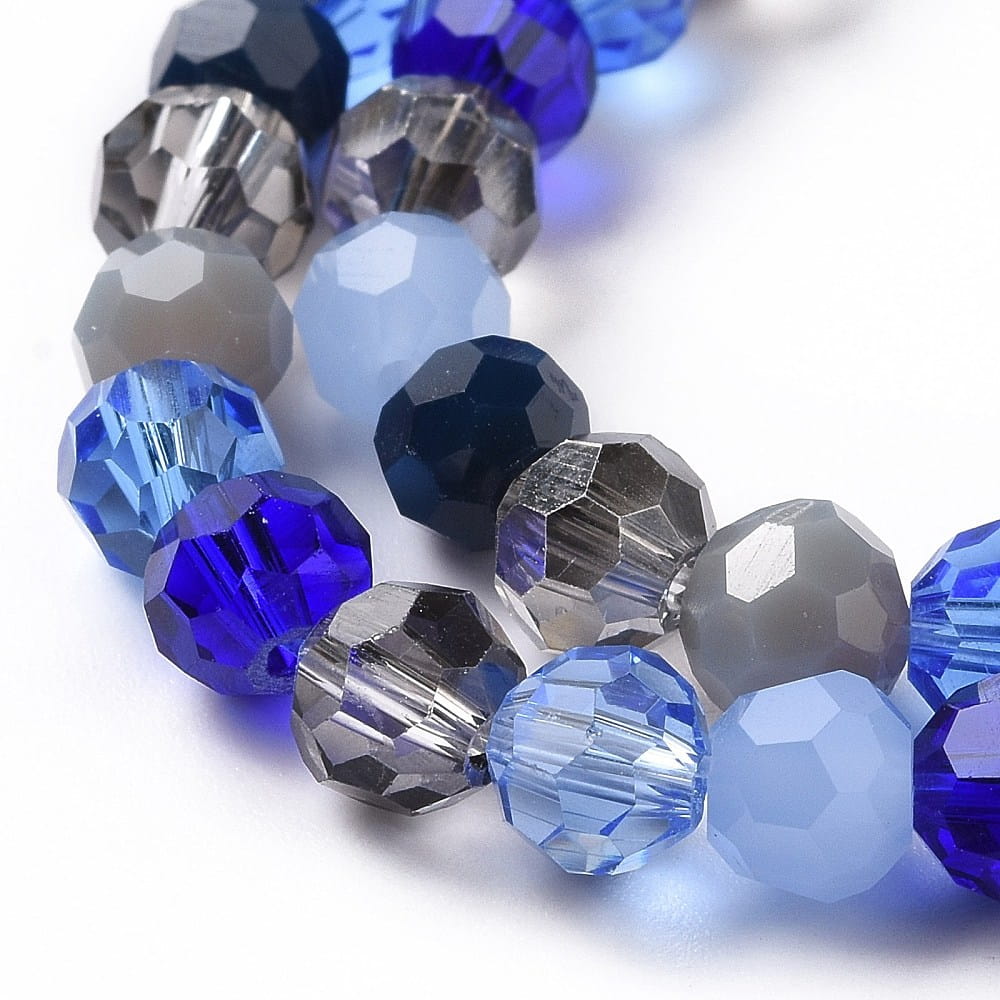 Koraliki szklane fasetowane mix odcieni niebieskiego i szarego. Koraliki okrągłe fasetowane 6mm. 20 sztuk w zestawie.