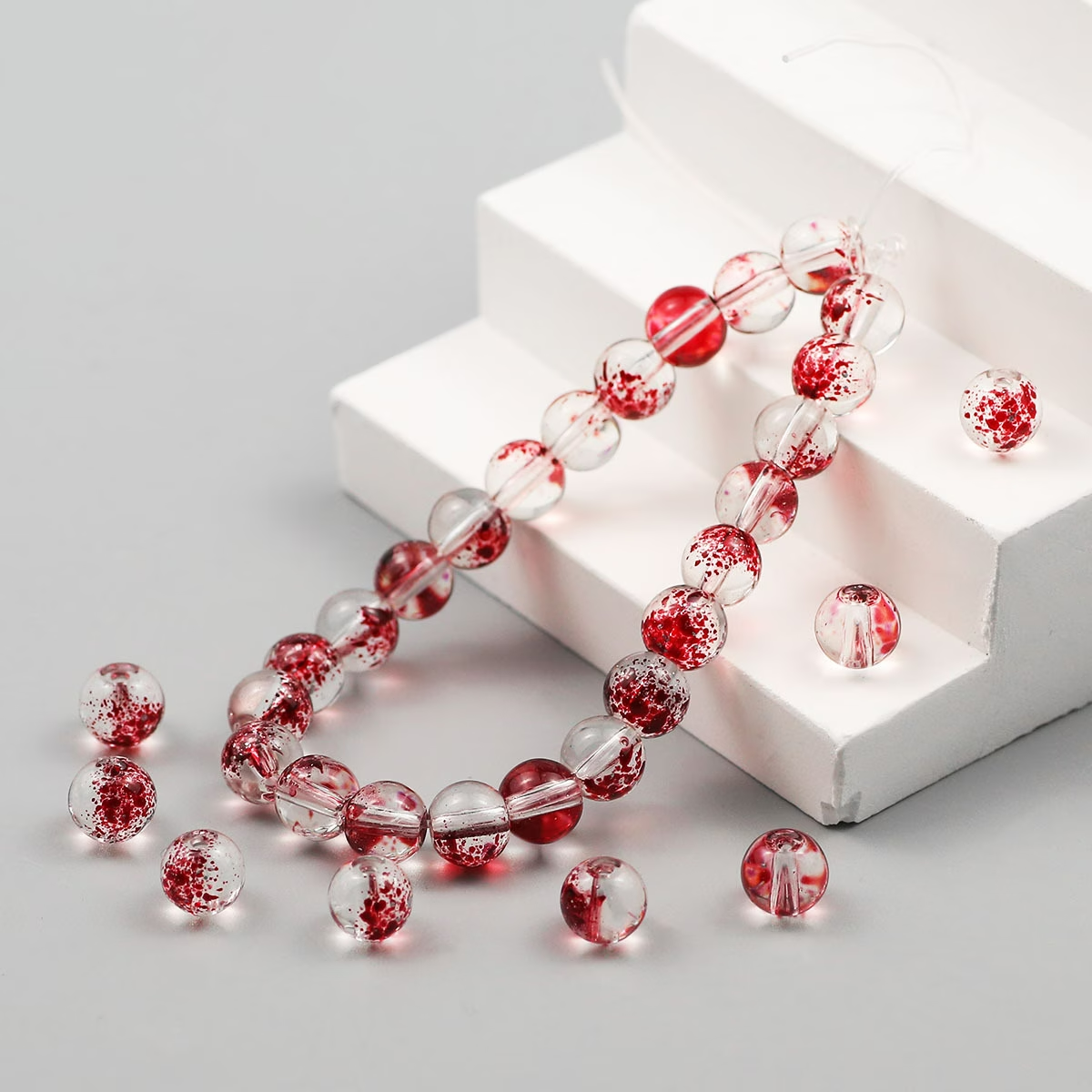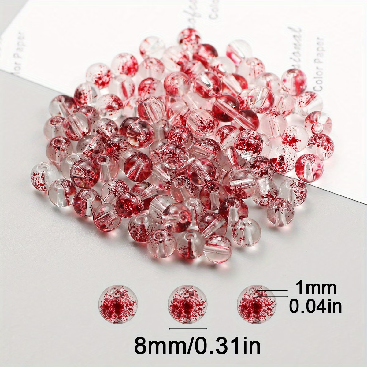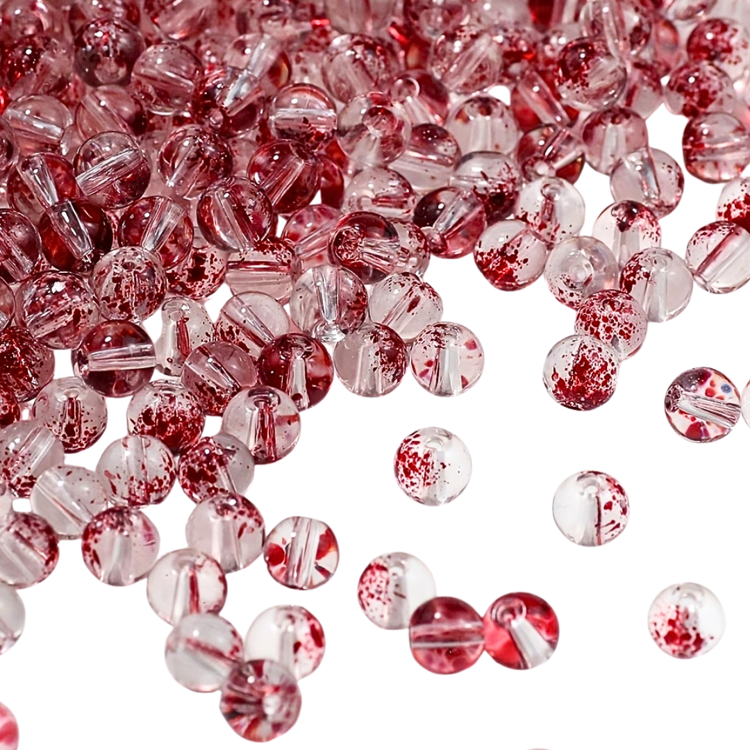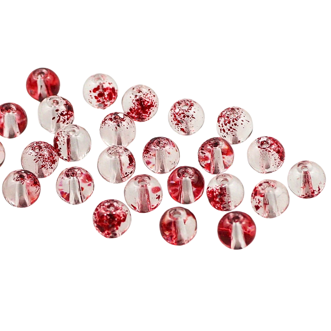 W opakowaniu znajdują się 10 koralików, przezroczyste w krwiste plamki. Idealne, jeśli robisz bransoletki i inne wyroby biżuterii hand made, zwłaszcza te personalizowane. Koraliki są wykonane ze szkła, nie tracą koloru, są przepiękne. Są świetne do wykonania breloków, zawieszek i zakładek do książek.