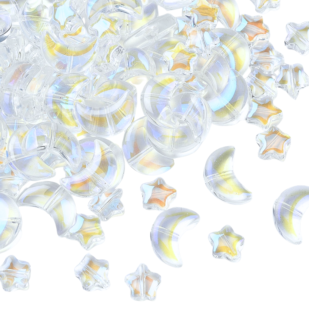 W opakowaniu znajdują się 10 koralików, 5 księżycy, 5 gwiazdek, kolory opalizujące (powłoka AB). Idealne, jeśli robisz bransoletki i inne wyroby biżuterii hand made, zwłaszcza te personalizowane. Koraliki są wykonane ze szkła, nie tracą koloru, są przepiękne i cudownie się mienią pod światło. Można je wtapiać w żywice epoksydowe. Są świetne do wykonania breloków, zawieszek i zakładek do książek.