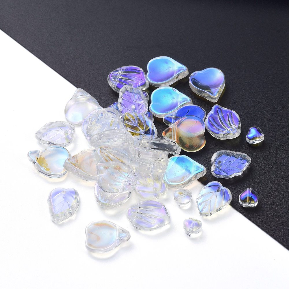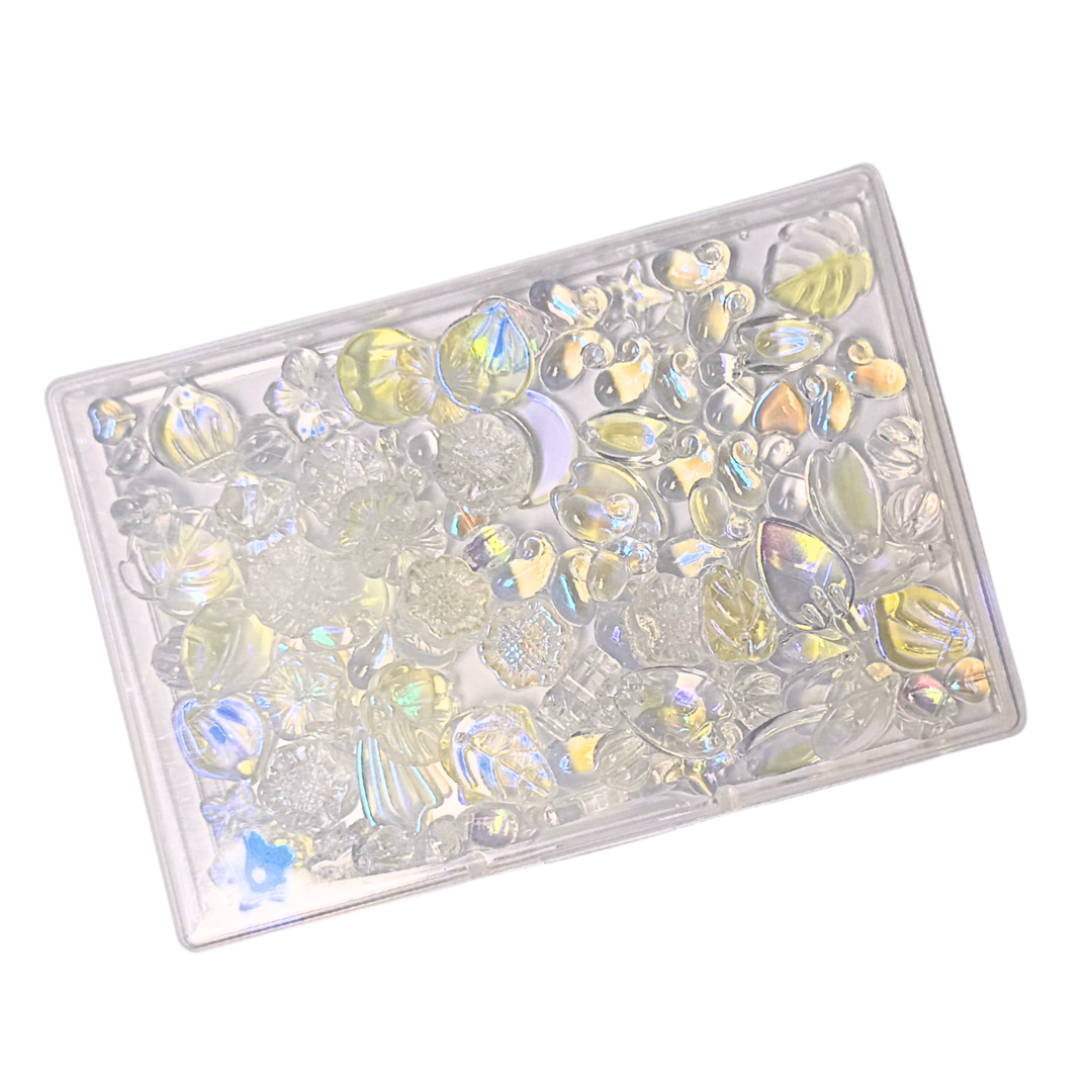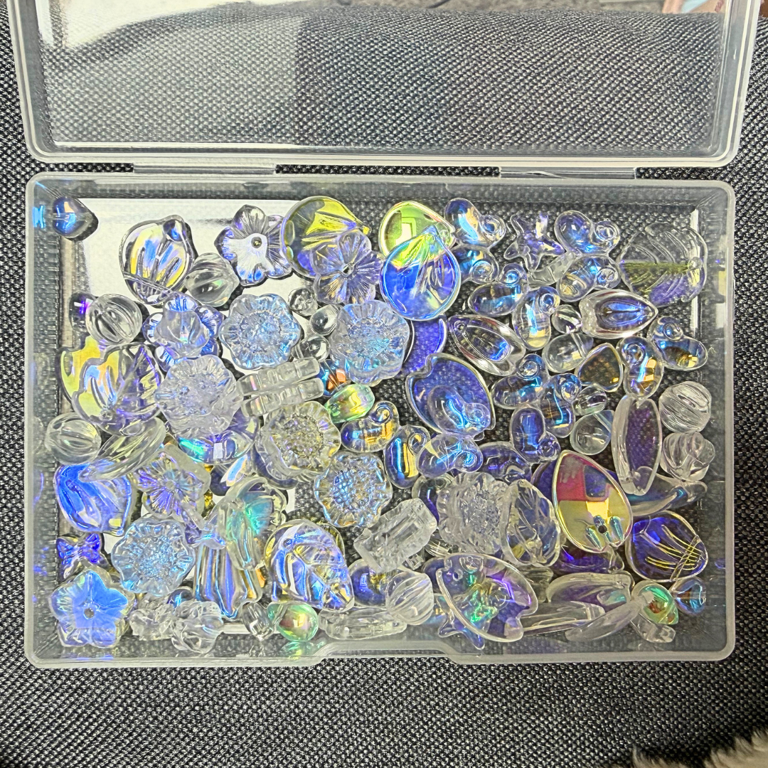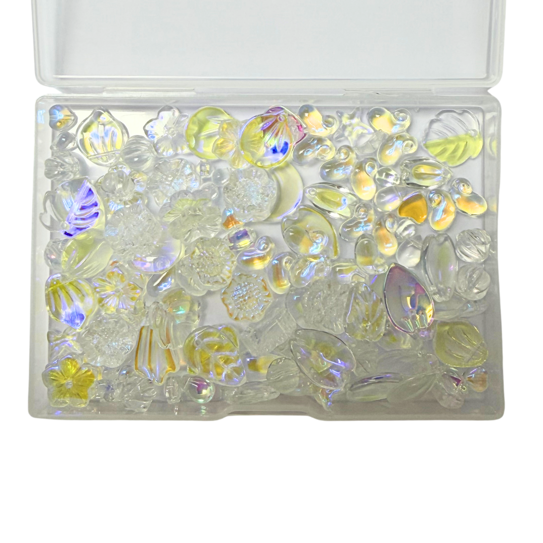 Koraliki szklane w różnych ciekawych kształtach. Zestaw 100 sztuk w praktycznym boksie.