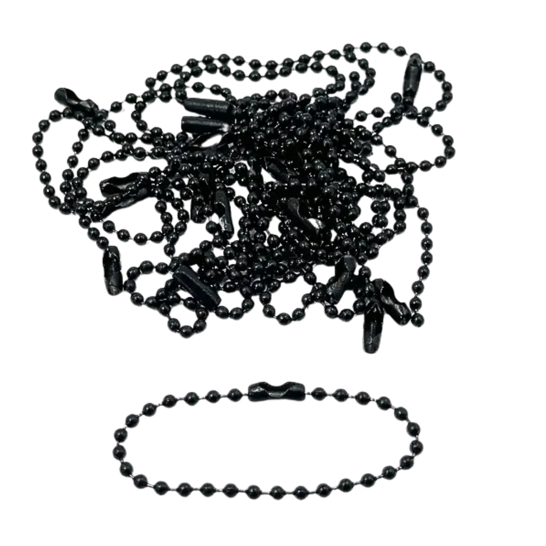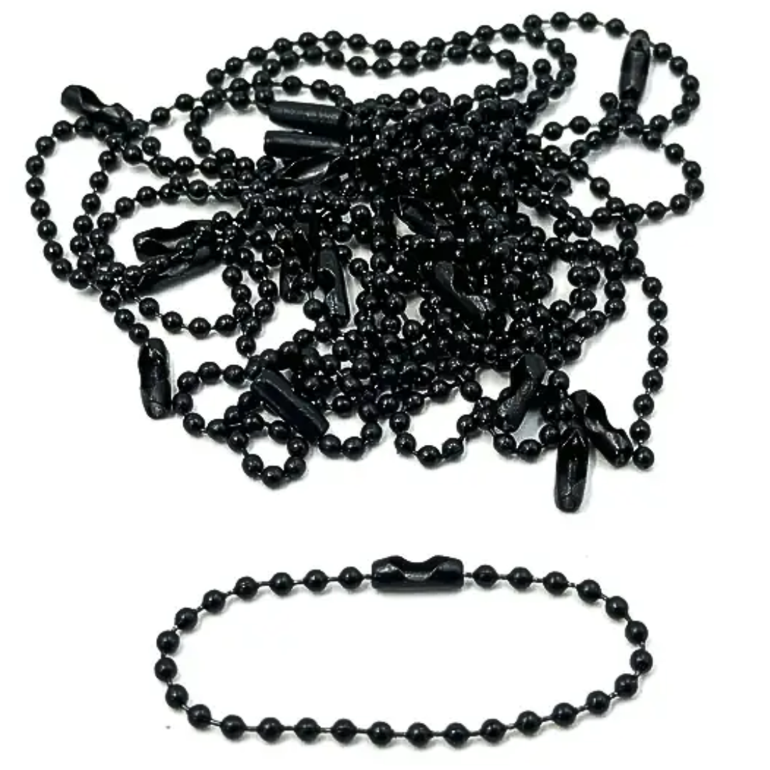 Łańcuszki kulkowe z zapięciem, metalowe, czarny kolor. Grubość około 2mm. Sprzedawany w kawałku o długości 10 cm. Do tworzenia biżuterii, rękodzieła. Znakomicie sprawdza się np. przy łączeniu papierowych metek z produktami.