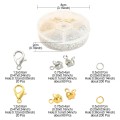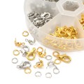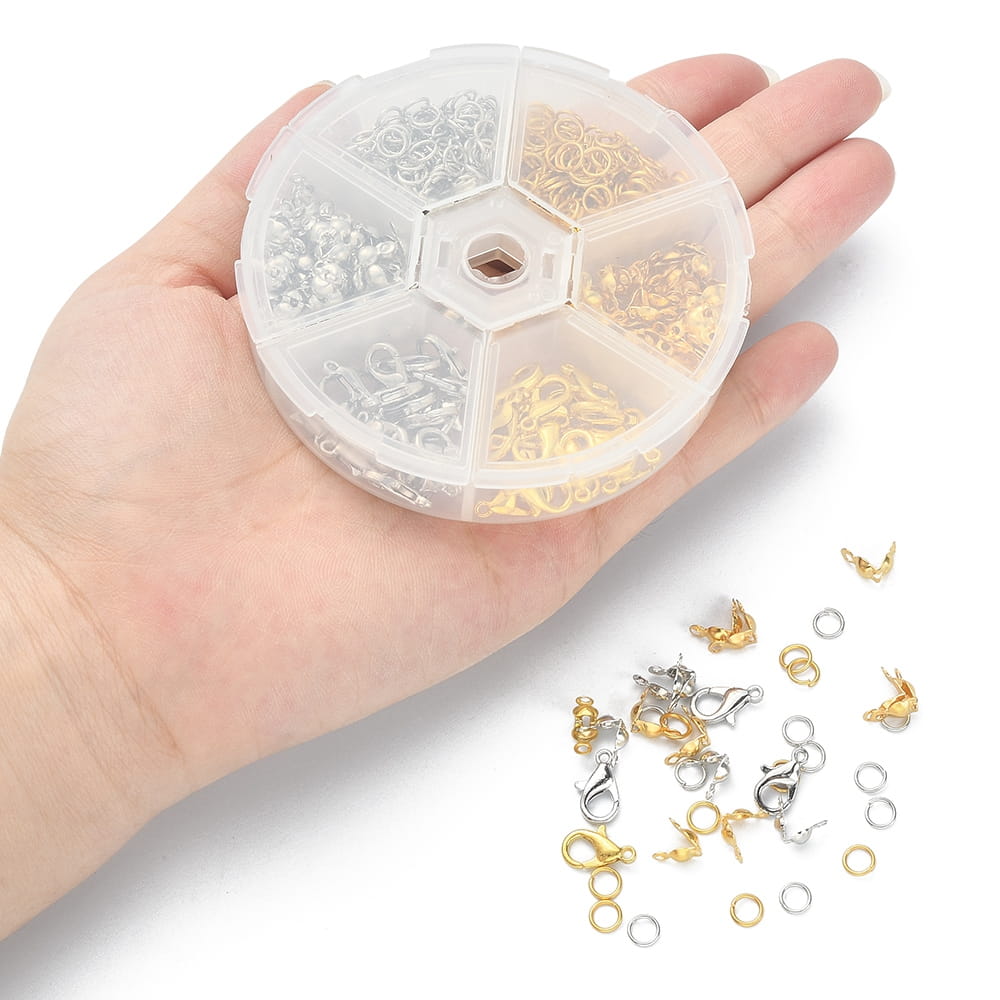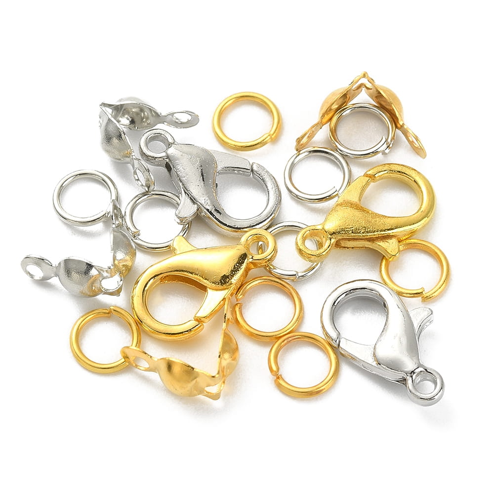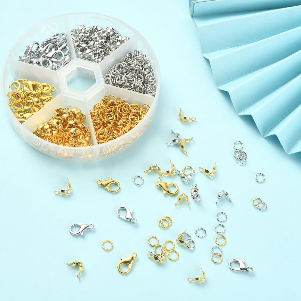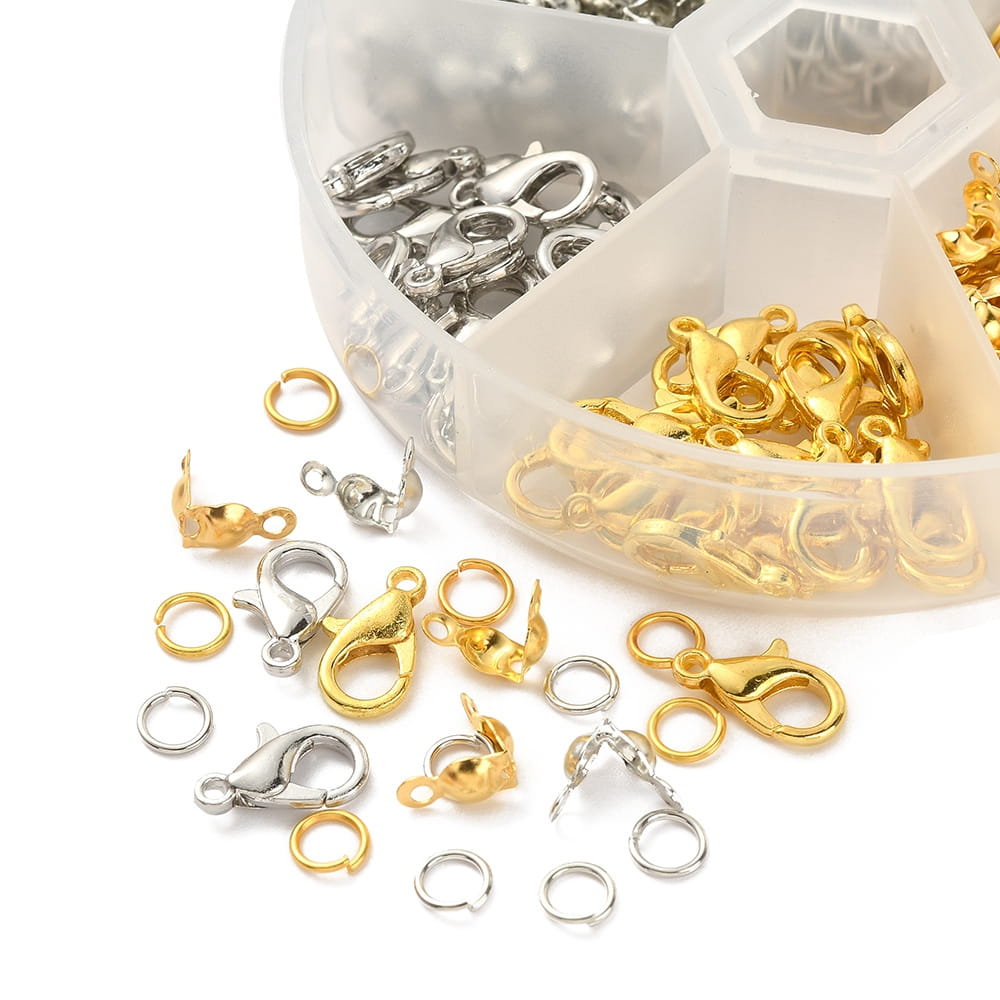 Metalowe prefabrykaty w dwóch kolorach: karabinki, ogniwa i łapaczki. Zapakowane w praktyczną karuzelkę plastikową z otwieranymi komórkami, co pozwala na ich utrzymanie w należytym porządku. Sześć różnych rodzajów, ilość poszczególnych prefabrykatów podana na jednym ze zdjęć, w tym 400 ogniw, 40 karabinków oraz 120 łapaczek. Podstawowe komponenty do tworzenia biżuterii, są absolutnie niezbędne, by stworzyć prawie każdą biżuterię hand made, od kolczyków, poprzez naszyjniki i bardzo modne bransoletki czy różańce.