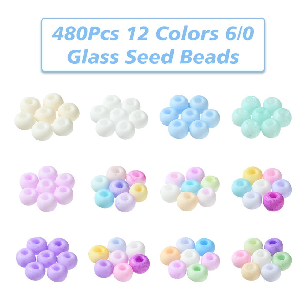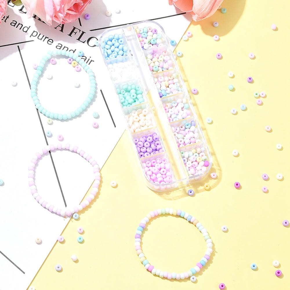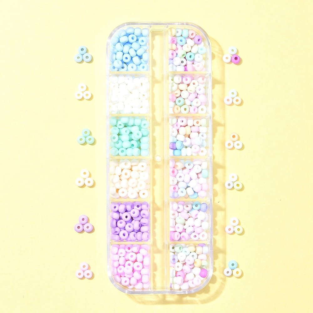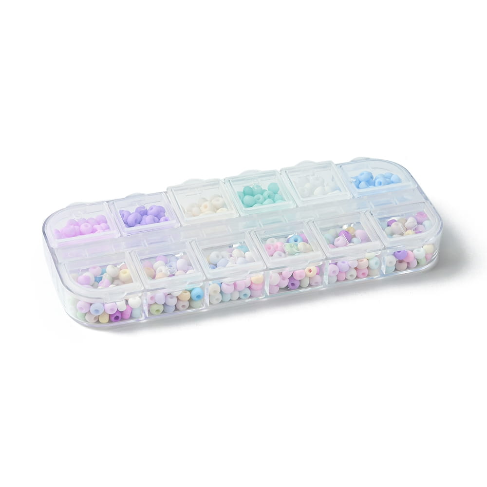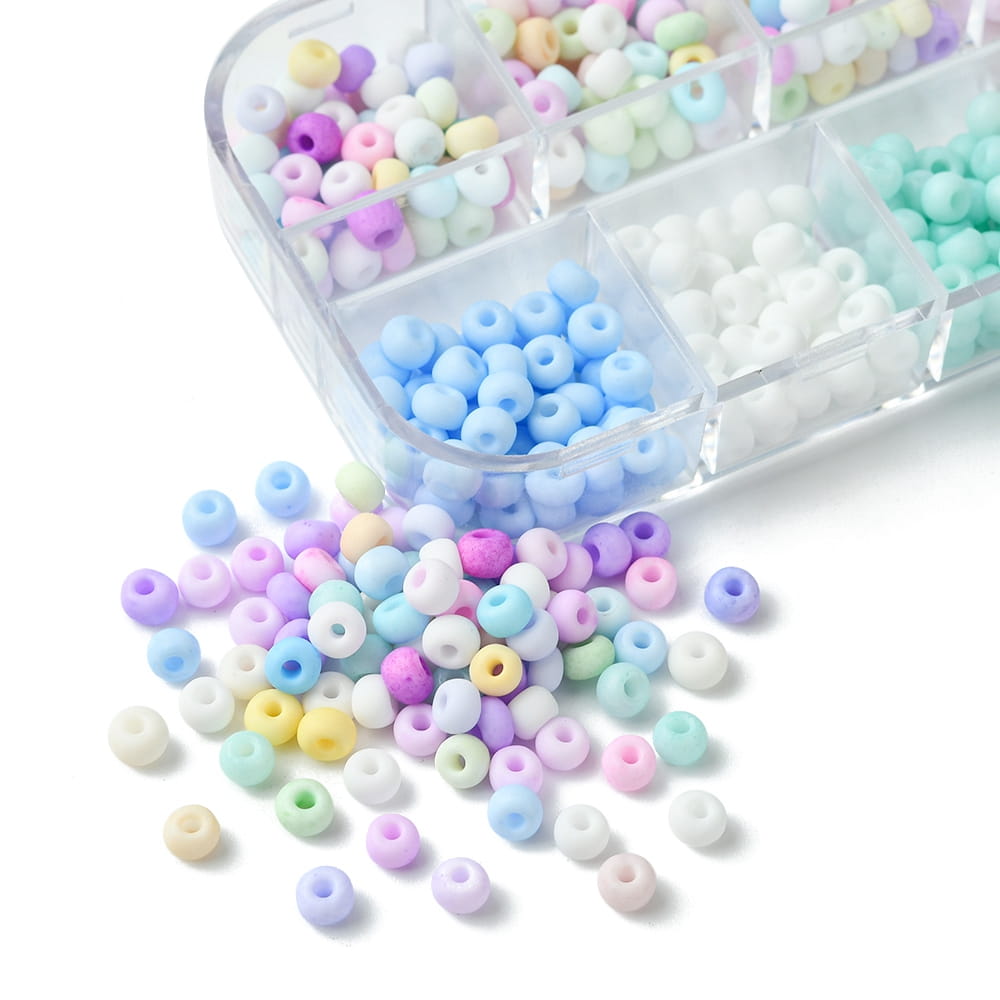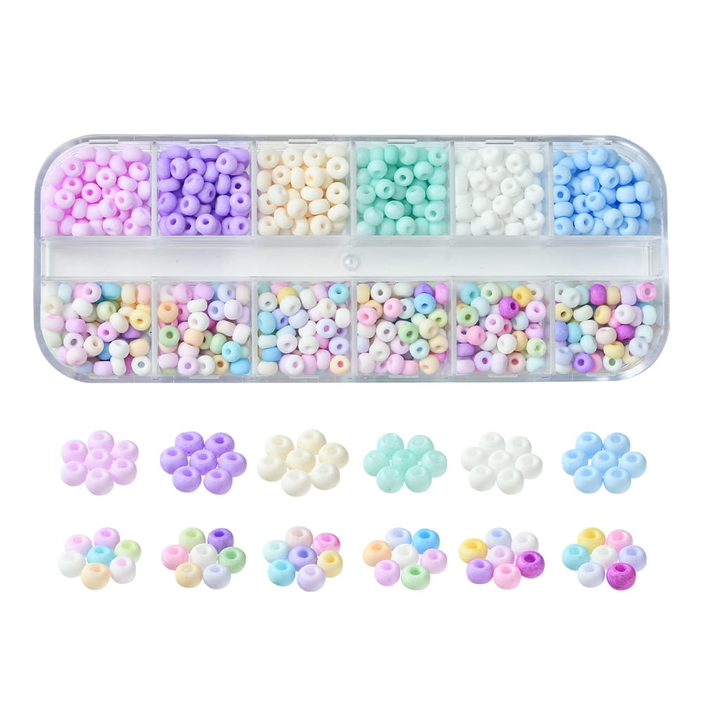 Piękne szklane koraliki rokail rocaille, pastelowe kolory, matowe szronione wykończenie. 12 pięknych pastelowych kolorów. Koraliki 6/0 szklane drobne 480 sztuk w kasetce.