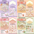 Zacznij wspaniałą zabawę z naklejkami 3D. Każdy pojedynczy pakiet składa się z kartonowego rzutu pomieszczenia (dwie ściany i podłoga), do tego jeden duży arkusz naklejek z elementami wyposażenia, czyli meble, dywan, półki oraz z postaciami - to śliczne białe króliczki.