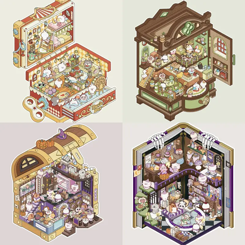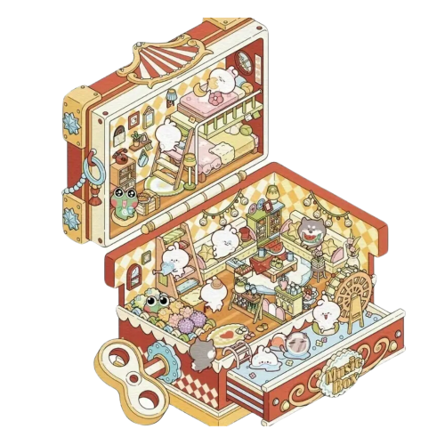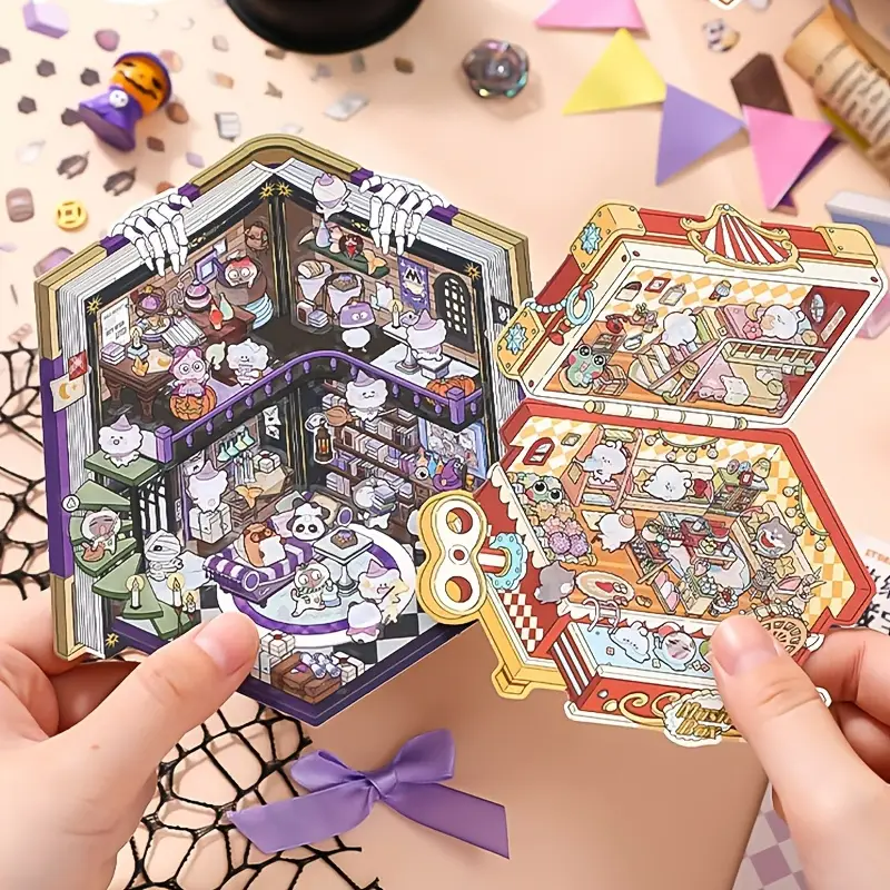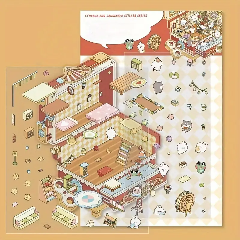 Zacznij wspaniałą zabawę z naklejkami 3D. Zestaw składa się z kartonowego rzutu wnętrza skrzyni, już wyciętego, do tego aż dwa duże arkusze naklejek z elementami wyposażenia (meble, dywan, półki, inne) oraz drugi, z postaciami i ozdobami pomieszczenia - to śliczne zwierzątka, pieski, kotki, króliki, pandy, postacie osób i inne.