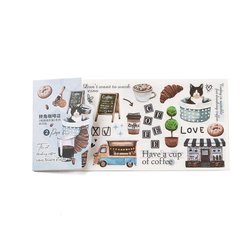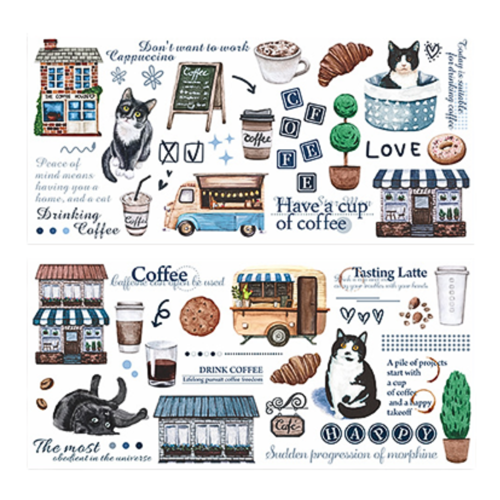 ZESTAW NAKLEJEK winylowych - bardzo dobra jakość, wodoodporne. Dwa różne arkusze naklejek. Kawa kawosz koty kotki. Świetne do scrapbookingu.