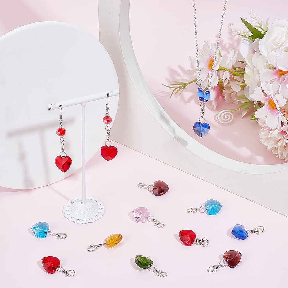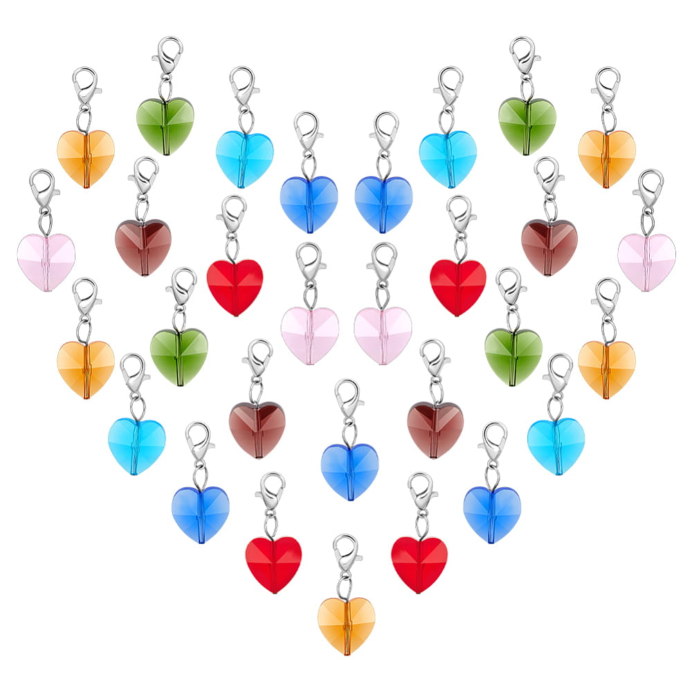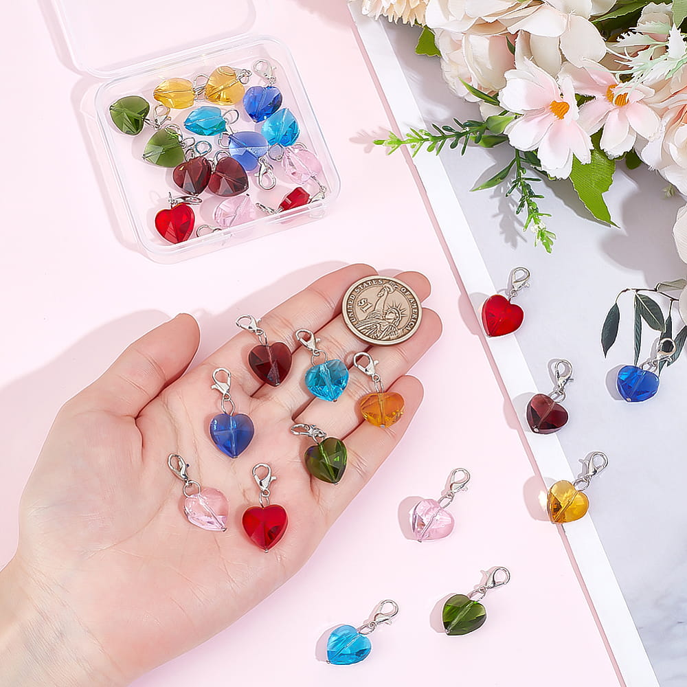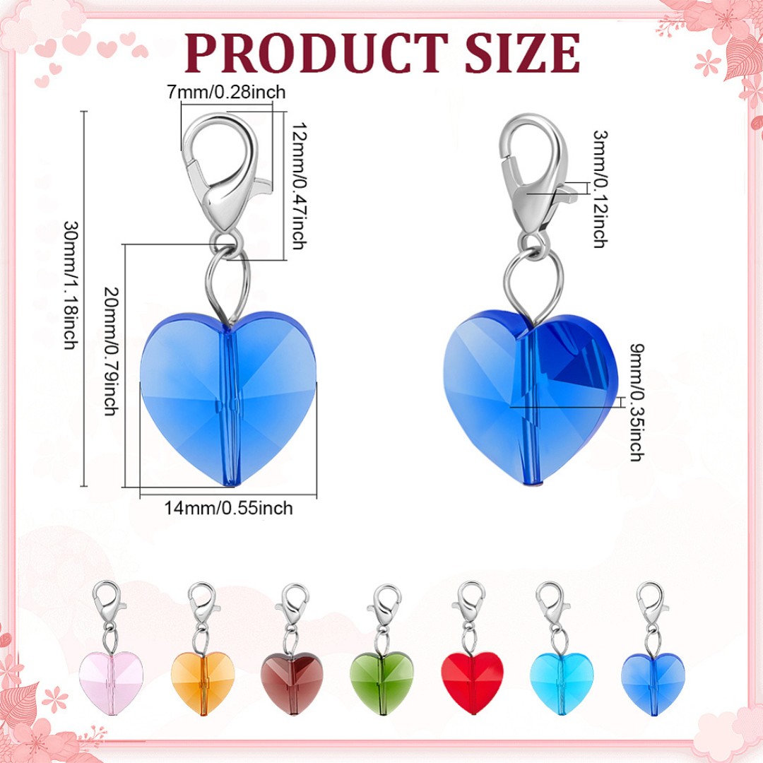 Piękne zawieszki mini brelok z karabinkiem - kryształowe serduszko szklane. W komplecie 7 zawieszek, każda w innym kolorze. Gotowe do przypięcia do bransoletki czy ozdobienia torebki.