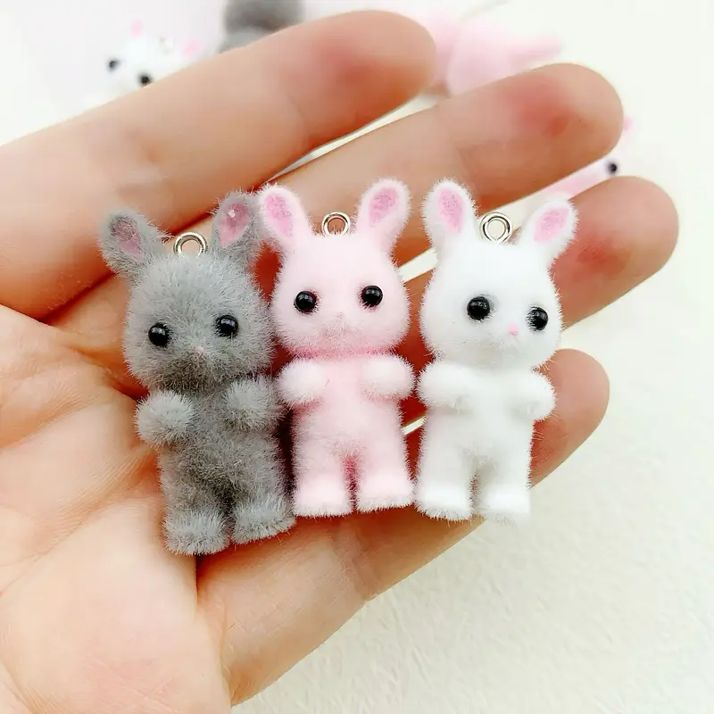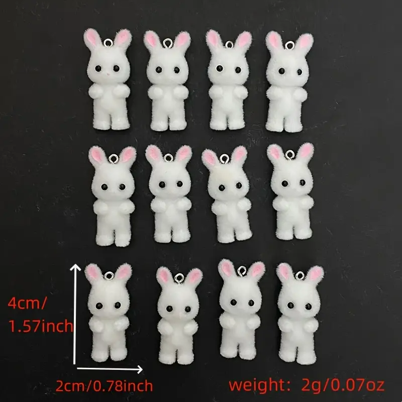 Zawieszka jest bardzo pięknie wykonana, dosyć duża, z metalowym oczkiem montażowym o średnicy 2 mm, jest wykonana z żywicy akrylowej, pokrytej małymi włoskami - wygląda jak prawdziwe futerko. Króliczek ma różowe uszy i czarne oczka.