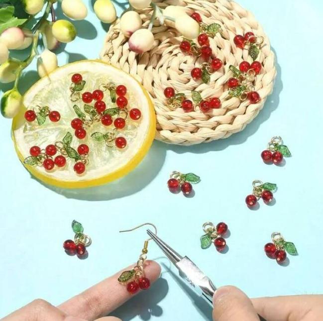 Świetne do ozdobienia piórnika, do breloków, torebek, zakładek do książki, do bransoletek i innych wyrobów biżuteryjnych. Zapakowane w woreczek strunowy. Idealne również do wykonania pary kolczyków w modnej obecnie stylizacji z owocami. Pięknie wykonane, precyzyjnie.