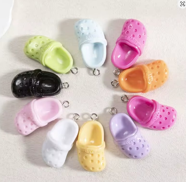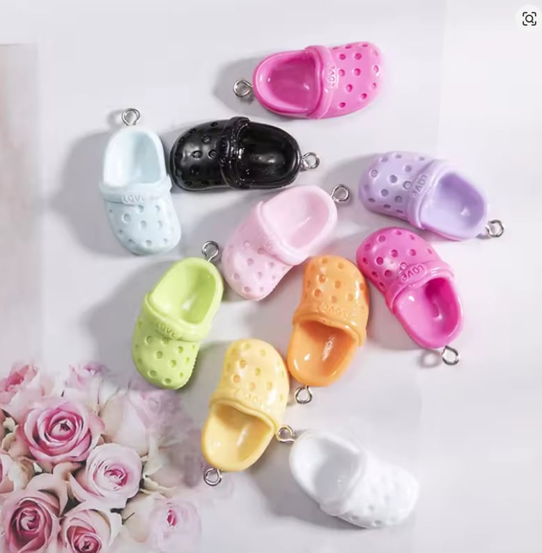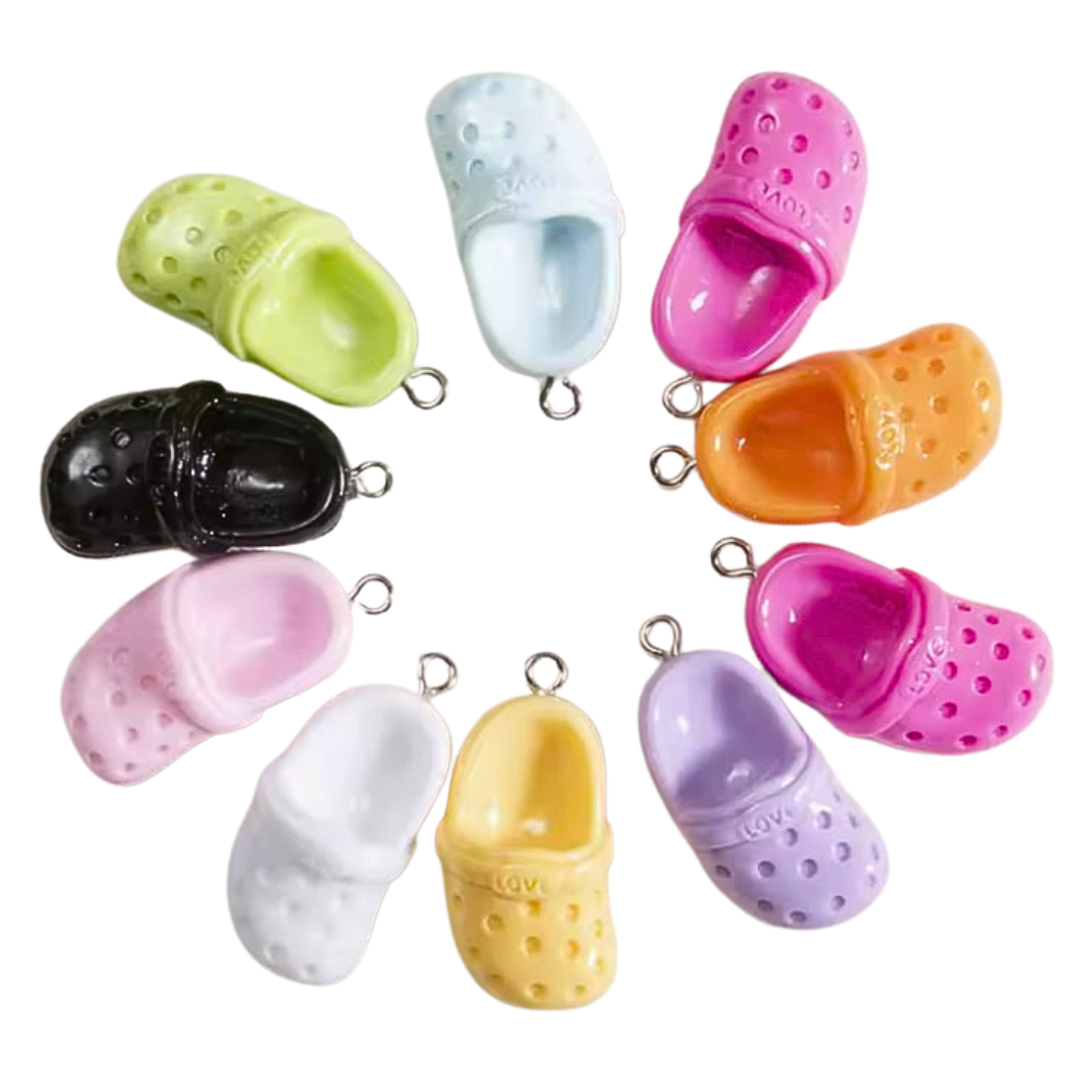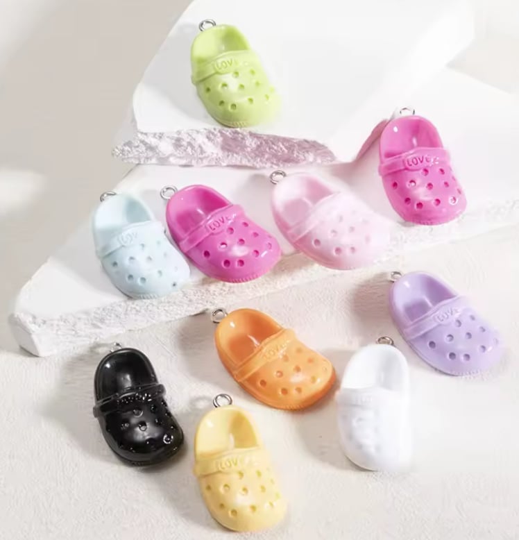 Zestaw 5 zawieszek klapek bucik klapki z napisem LOVE. Każda zawieszka z reguły w innym kolorze, zestaw pięciu różnych. Dobrane losowo.