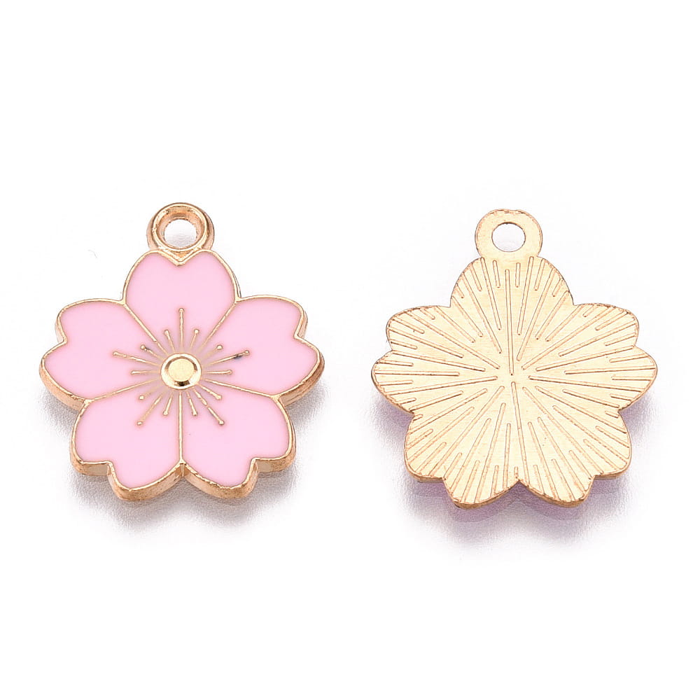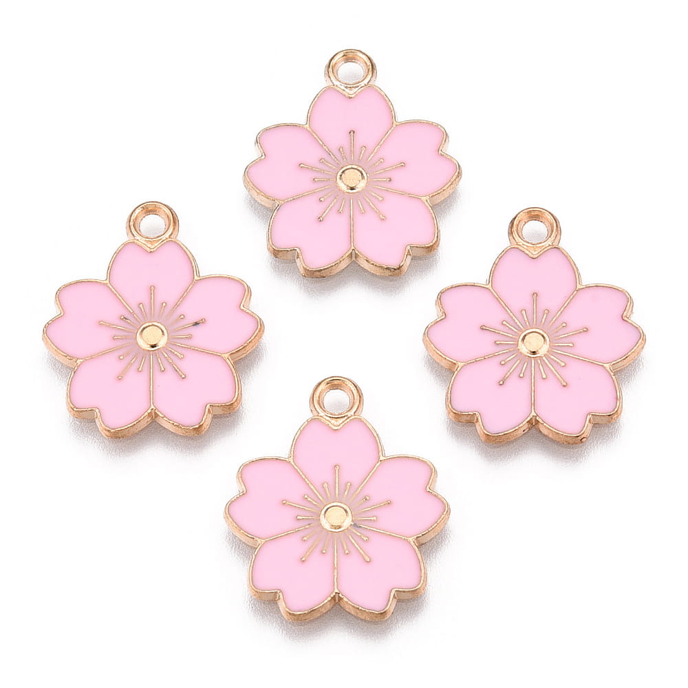 Ładnie wykonane zawieszki z metalu galwanizowanego na kolor złota, wypełnione różową emalią.