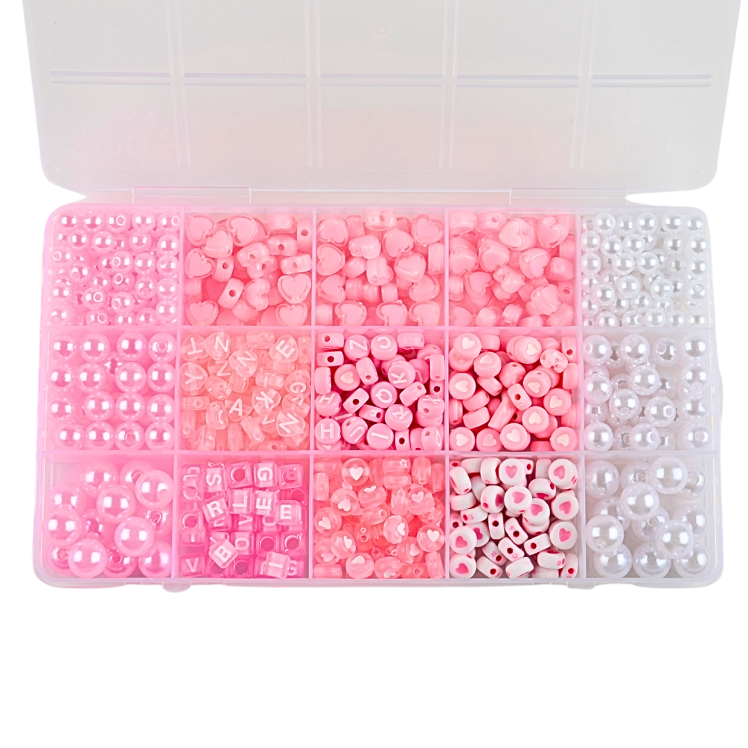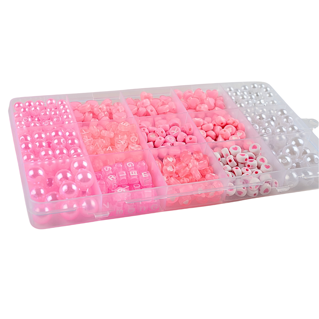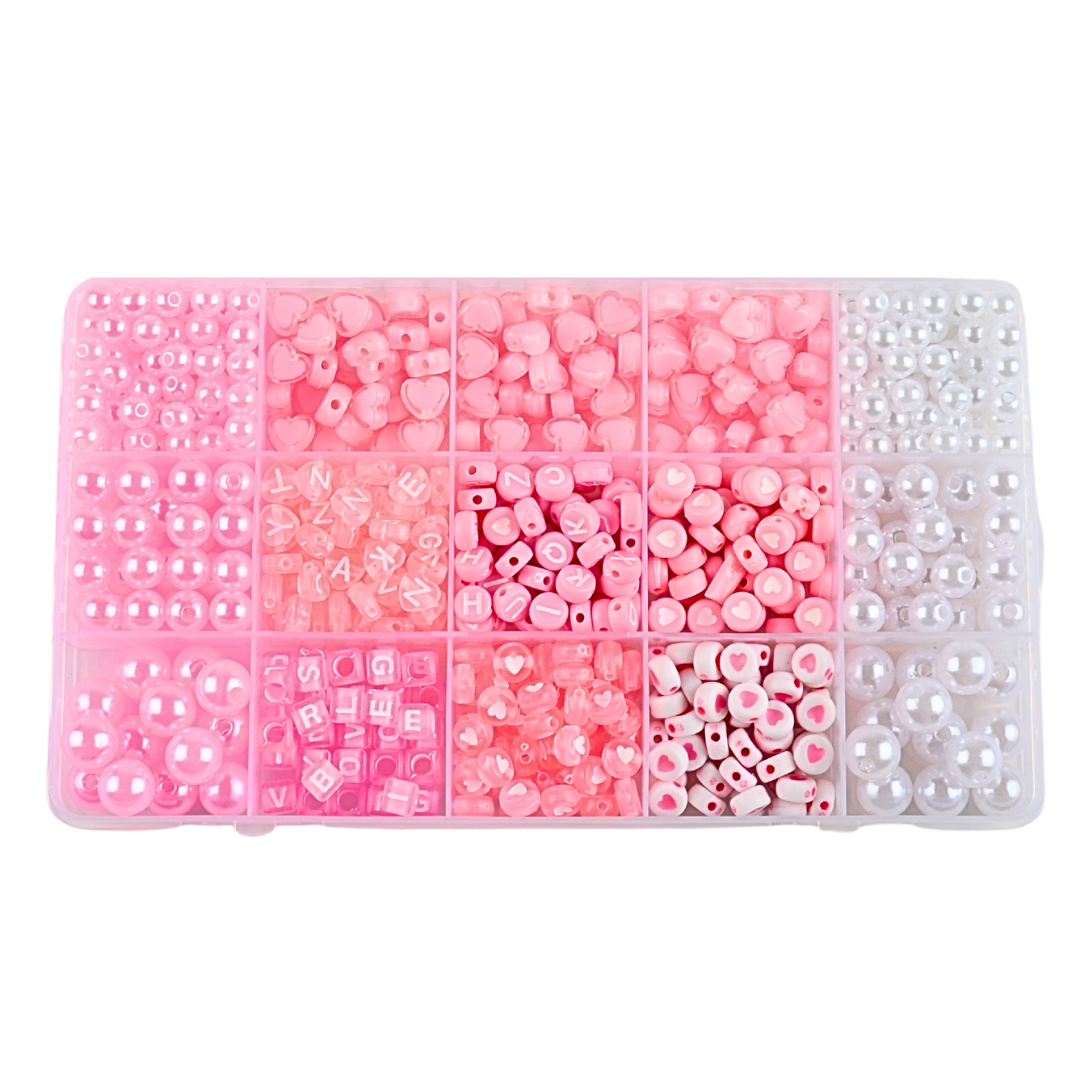 Koraliki: perełki białe w trzech rozmiarach, koraliki literki okrągłe i kostki, koraliki monetki z serduszkami, serduszka dwukolorowe, perełki różowe w trzech rozmiarach. .