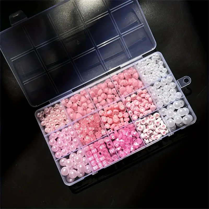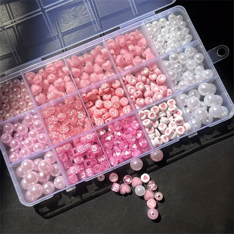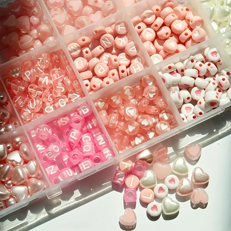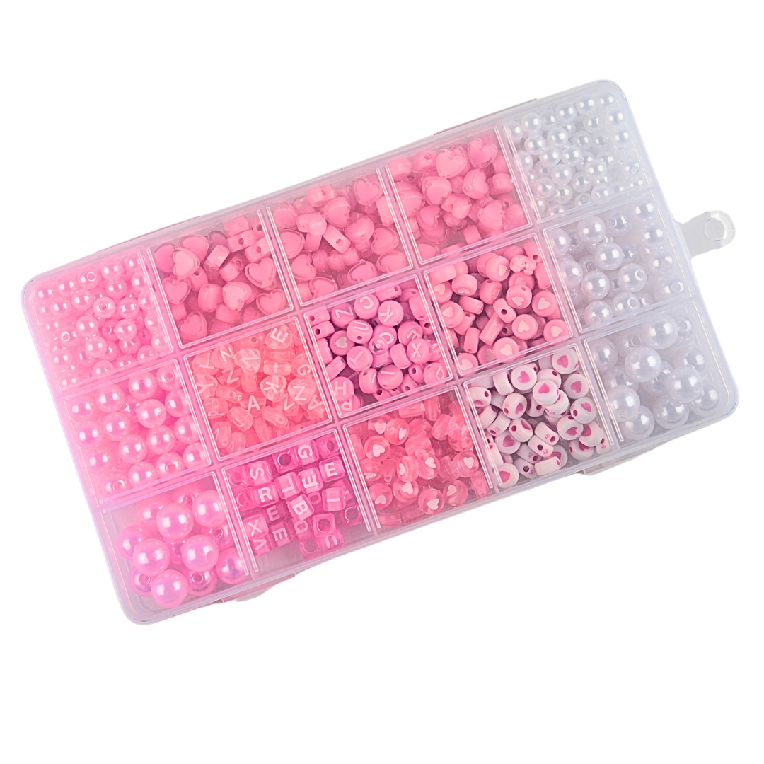 Koraliki: perełki białe w trzech rozmiarach, koraliki literki okrągłe i kostki, koraliki monetki z serduszkami, serduszka dwukolorowe, perełki różowe w trzech rozmiarach. .