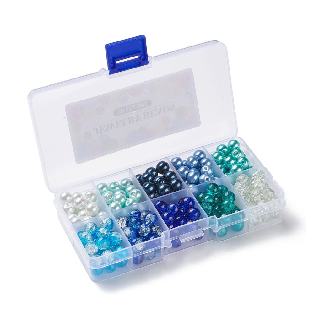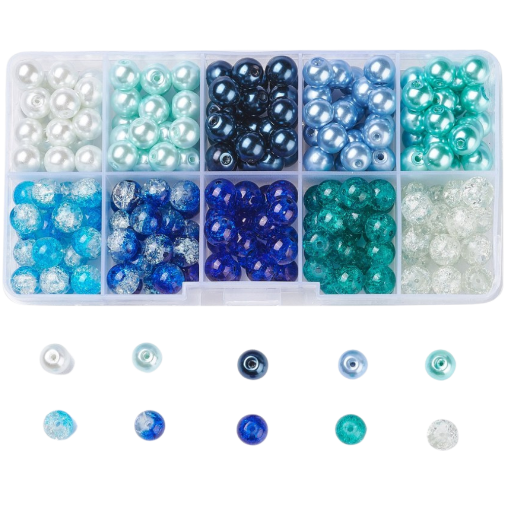 Zestaw NIEBIESKI koralików okrągłych szklanych kule kulki 8mm 10 kolorów koralików w organizerze. Koraliki crackle i perełki.