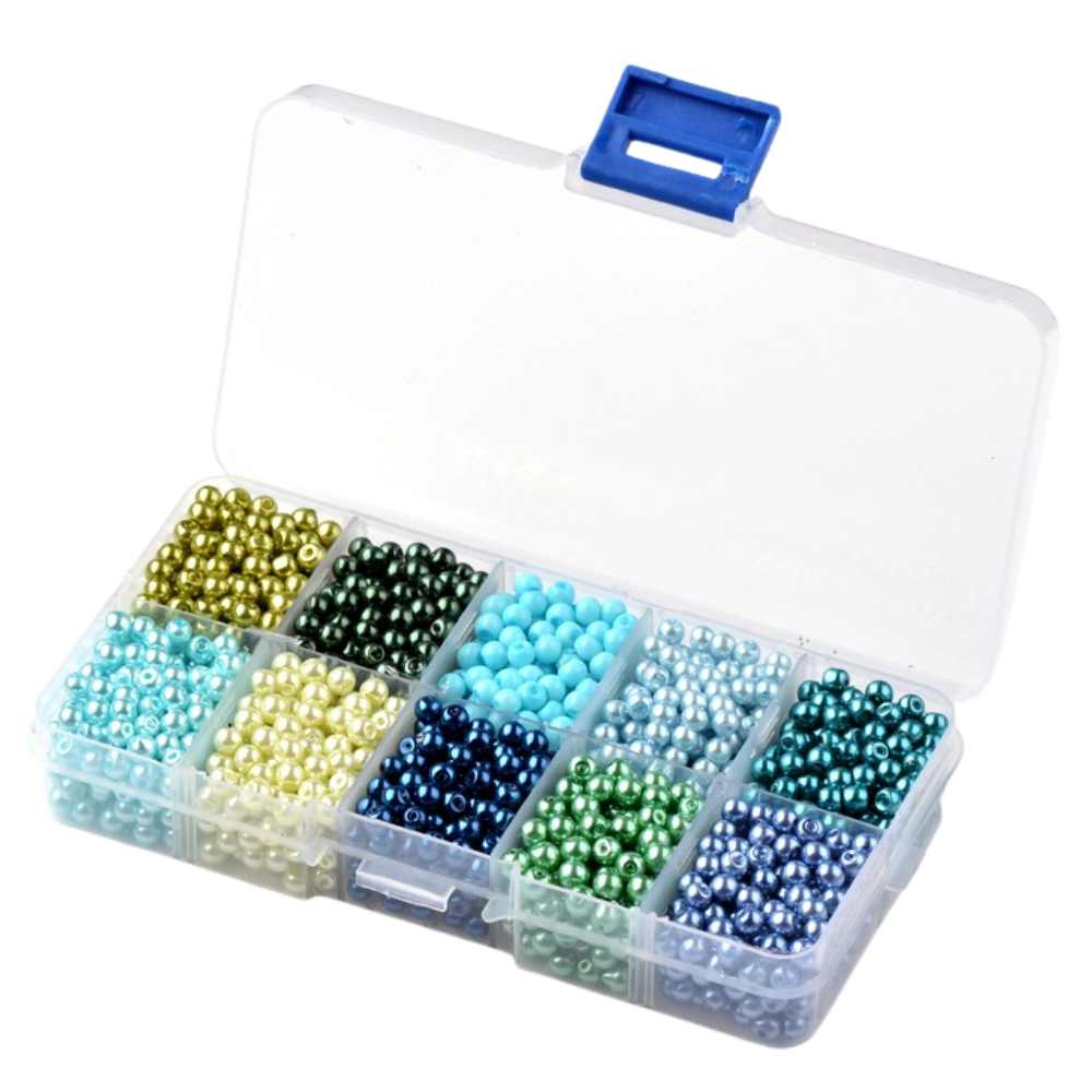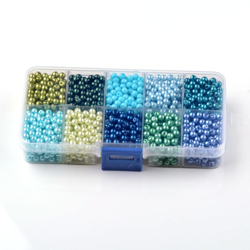 Zestaw koralików okrągłych szklanych kule kulki 4mm 10 kolorów koralików w organizerze. Koraliki perełki. Odcienie niebieskiego, zieleni i fioletu.